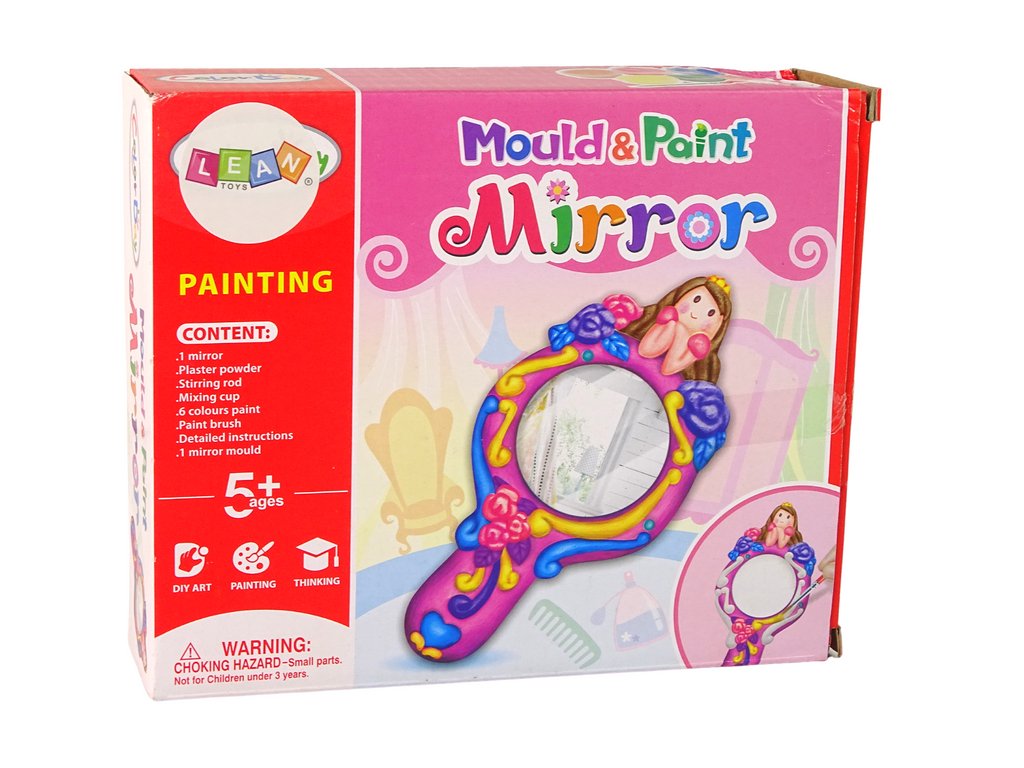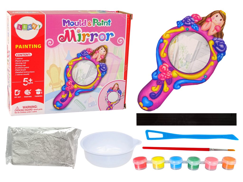A készlet mindent tartalmaz, amire szüksége van a tükör elkészítéséhez, beleértve a vakolatot, a formát, a tükörtartót és a narancssárga, sárga, kék, zöld, rózsaszín és piros árnyalatú festékeket . Nekik köszönhetően teljesen személyre szabhatja a tükröt elképzelései és ízlése szerint.