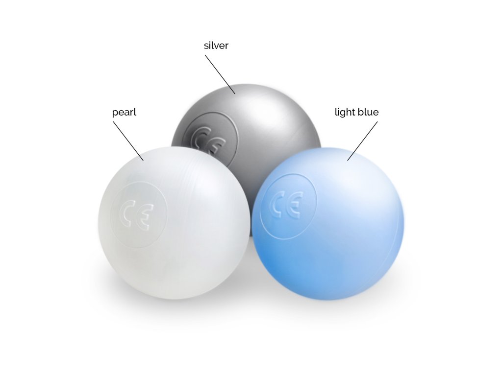 Labdák száraz medencébe Ø 6 cm 200 db (gyöngyház, ezüst, gyöngyház világoskék)