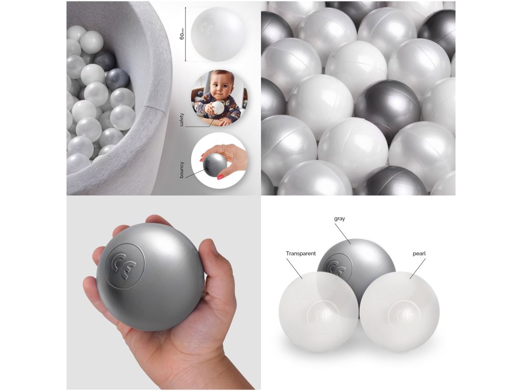 Labdák száraz medencébe 200 db (Ø 6 cm, gyöngyház, átlátszó, ezüst)