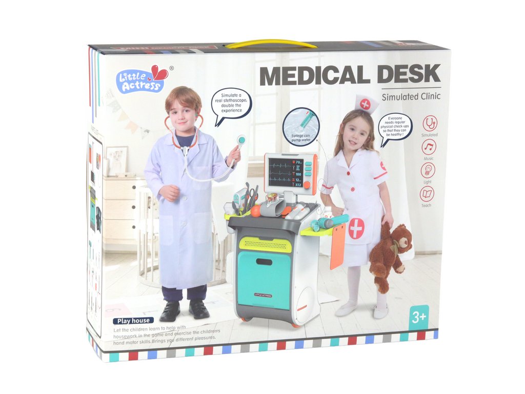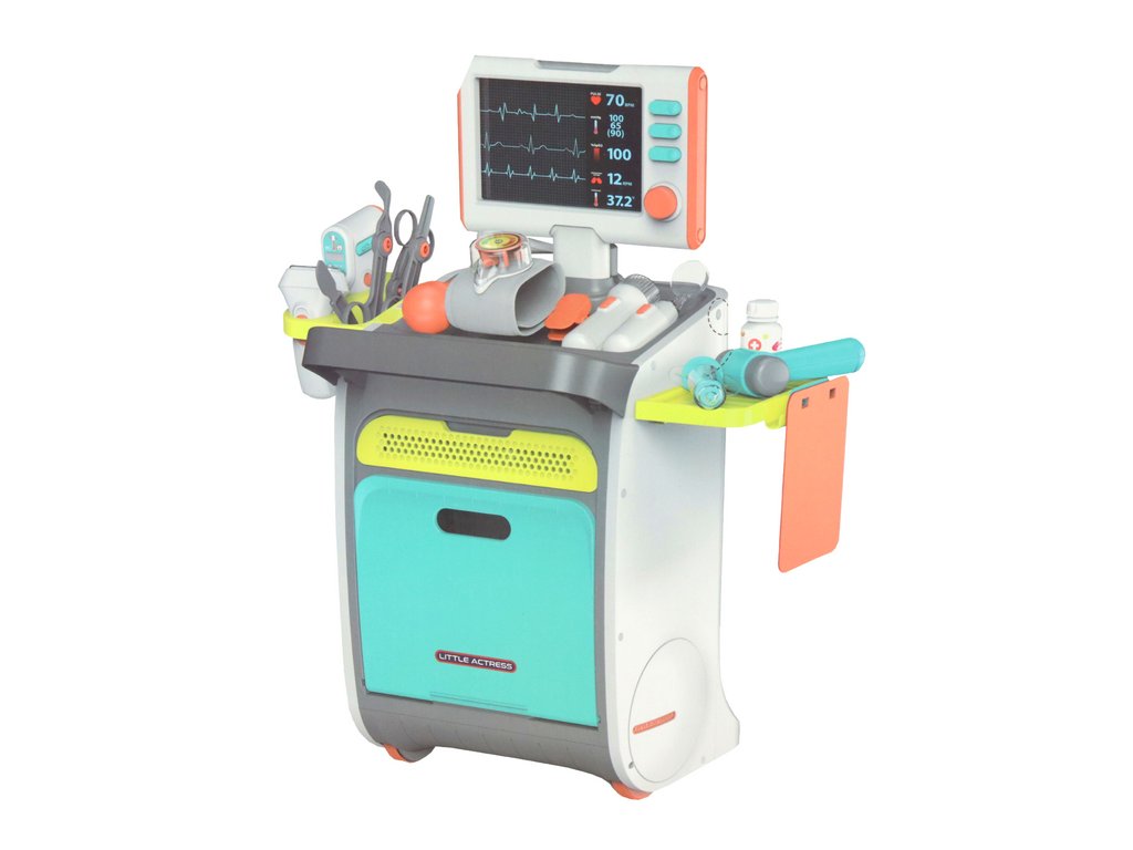 Az orvosi kocsit a könnyű játékra tervezték, három kerékkel és ergonomikus fogantyúval a könnyű mozgathatóság érdekében. A babakocsi hátulján állítható magasságmérő található, ideális a "páciens" mérésére, vagy praktikus elemként a babakocsi mozgatásához. Az EKG/röntgen-monitor panel interaktív elemet ad hozzá valósághű hanghatásokkal. A monitor bekapcsolása és az első gomb megnyomása után dobogó szív hangja hallható, a ritmus felgyorsulásakor pedig riasztás szólal meg. A második gomb négy dalt indít el, amelyek örömet és nevetést okoznak. A harmadik gomb öt különböző hangot generál, további lehetőségeket biztosítva a felfedezéshez.