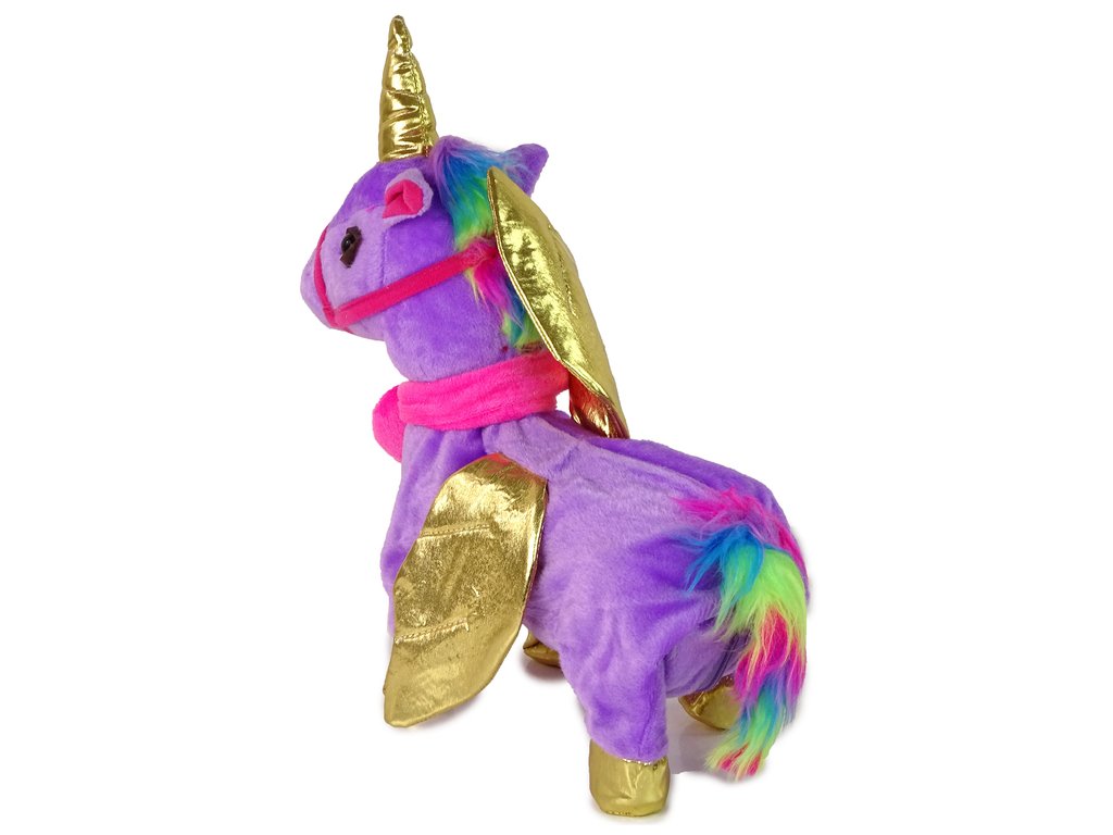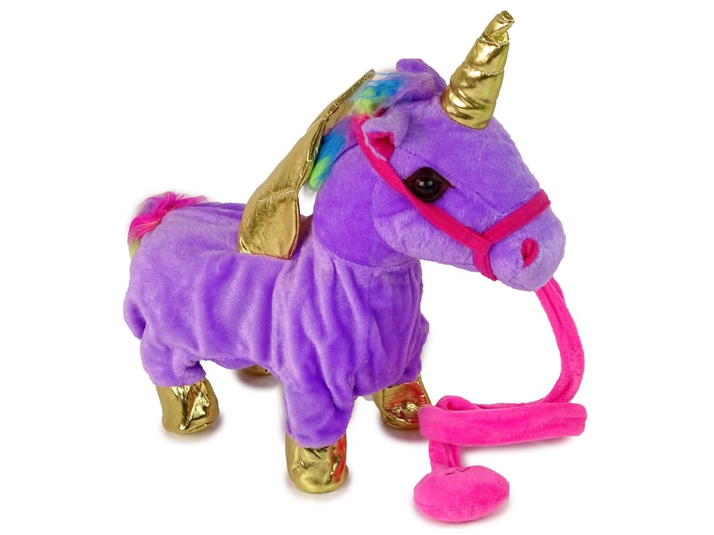 A legnagyobb gonddal készült interaktív egyszarvú lila színű, puha tapintású és arany szárnyai vannak. Az egyszarvú dorombol és egy country dallamot játszik. Az elemek behelyezése után csak nyomja meg a póráz fogantyúját, és az egyszarvú sétál, mozgatja a farkát és a fejét.