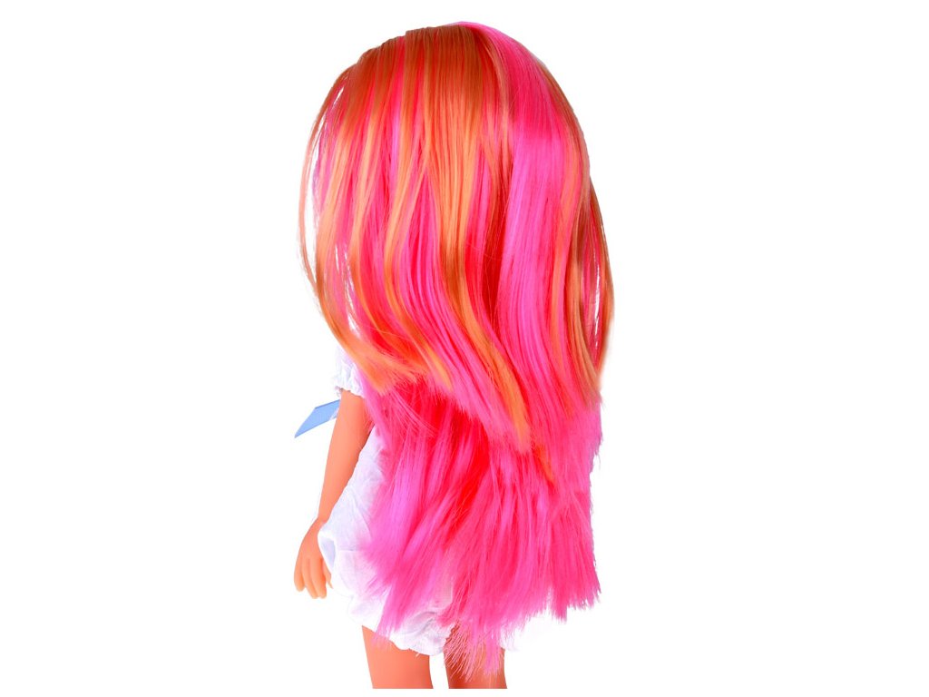 Ez az elegáns baba minden kislánynak örömet okoz! Neki van hosszú, világos, rózsaszín melírozott haja, amely fésülhető és sokféleképpen formázható. Gyönyörű, kék szalaggal és gyöngyökkel díszített fehér ruhát és fehér balerinacipőt visel, amelyek egyedi megjelenést kölcsönöznek neki.