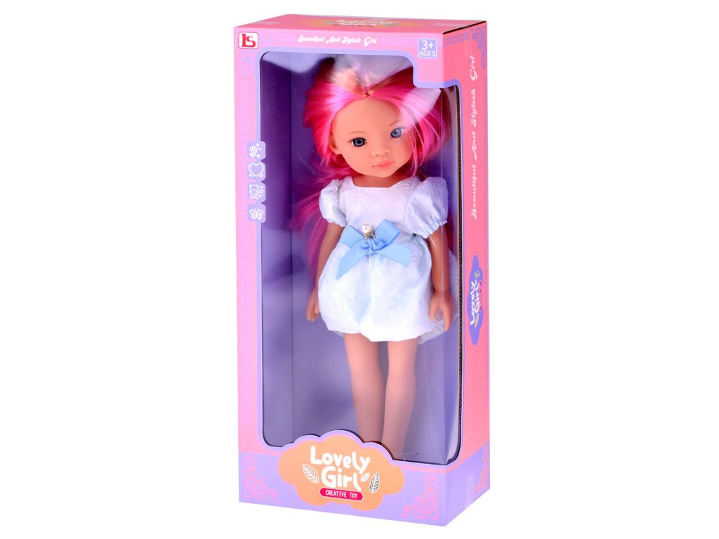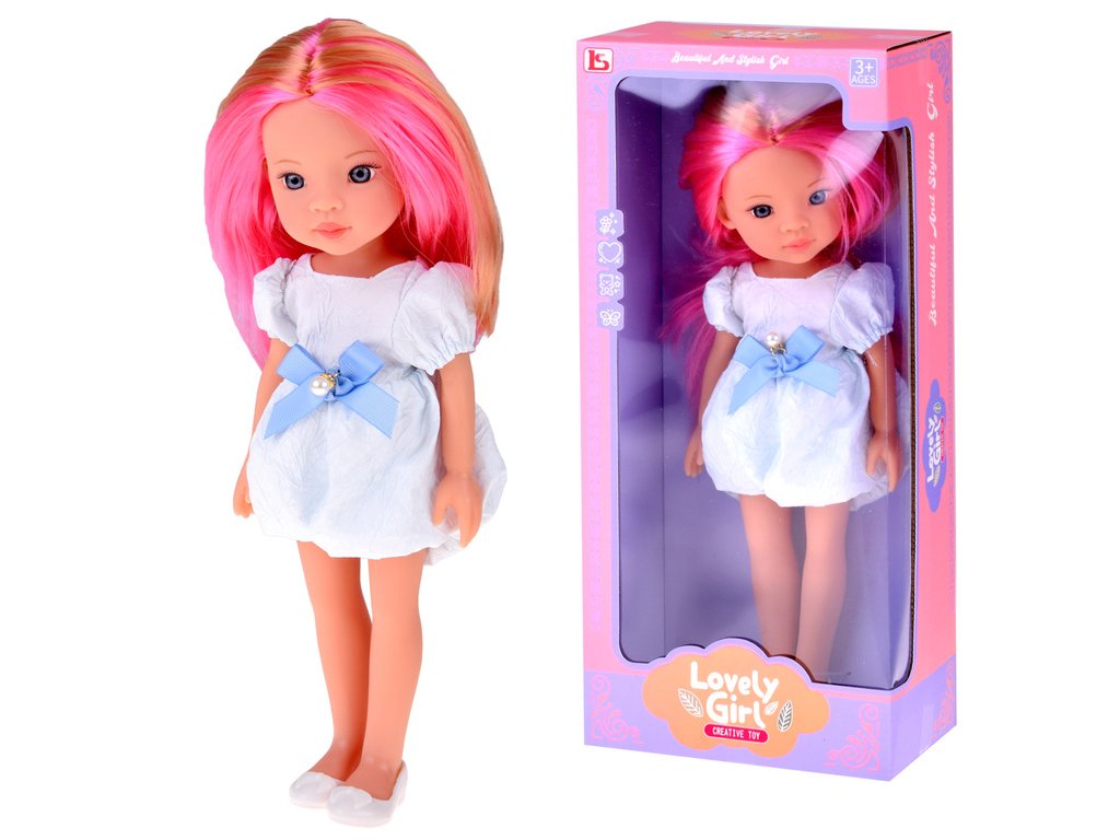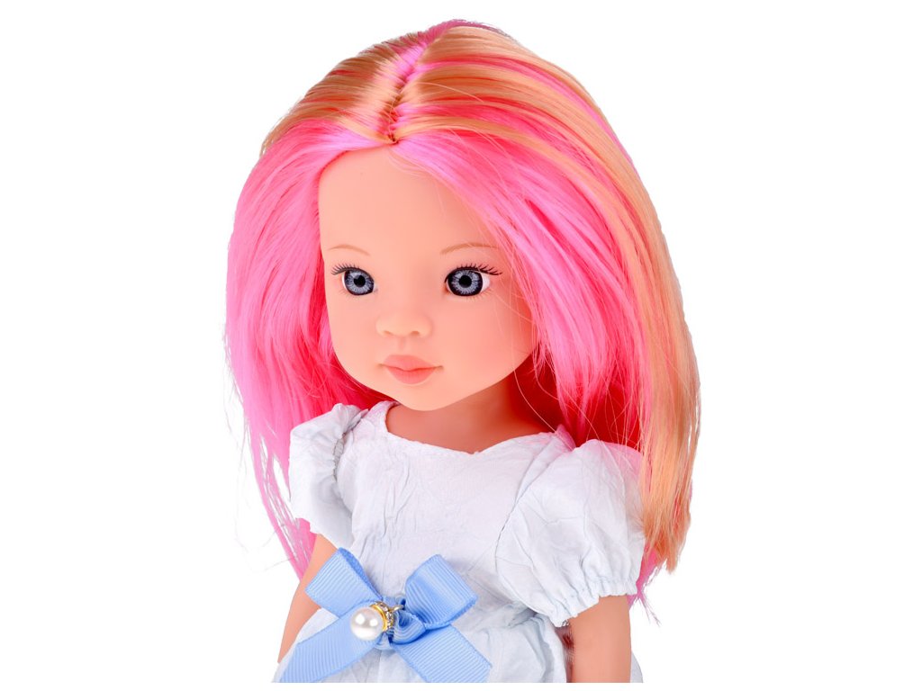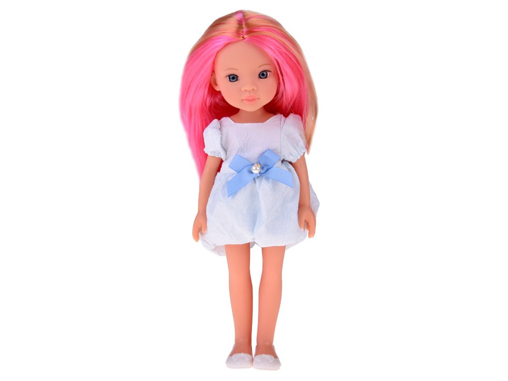 Lovely Girl Aranyos baba rózsaszín hajjal, fehér ruhában, kék masnival, 33 cm