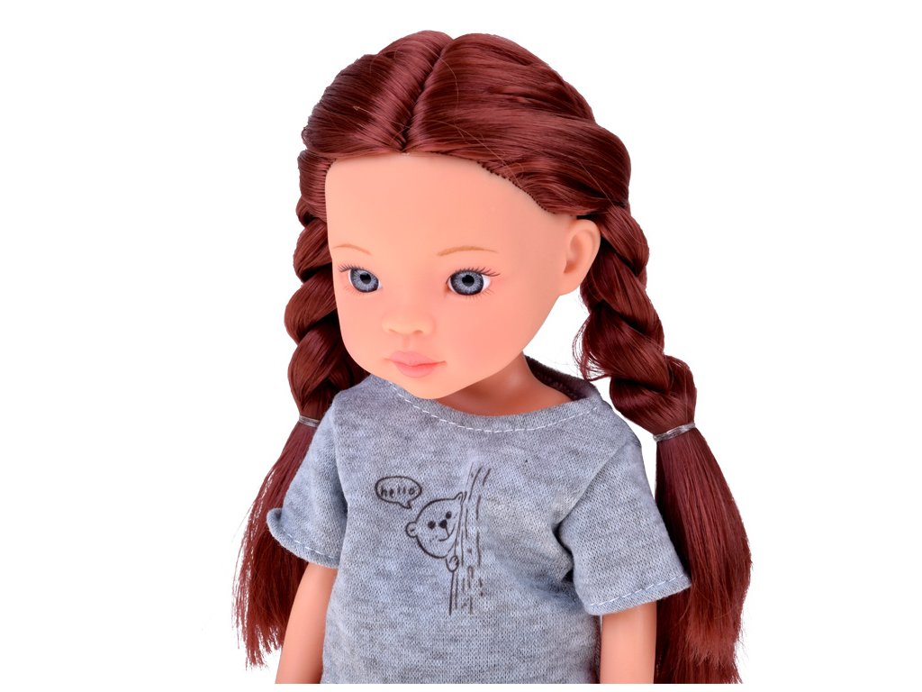 Ez a kivételes baba minden kislánynak örömet okoz! Hosszú, sűrű barna haja van, amely fésülhető és különféleképpen formázható. Kényelmes szürke, mintás pólót és barna melegítőnadrágot fehér csíkokkal és fehér sportcipőben, fűzővel. Stílusa ötvözi a modernitást és a kényelmet, ideális az aktív mindennapi kalandokhoz.