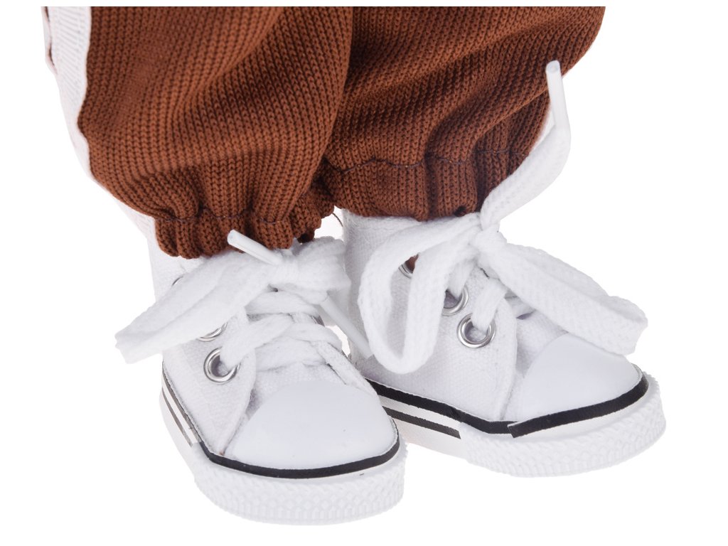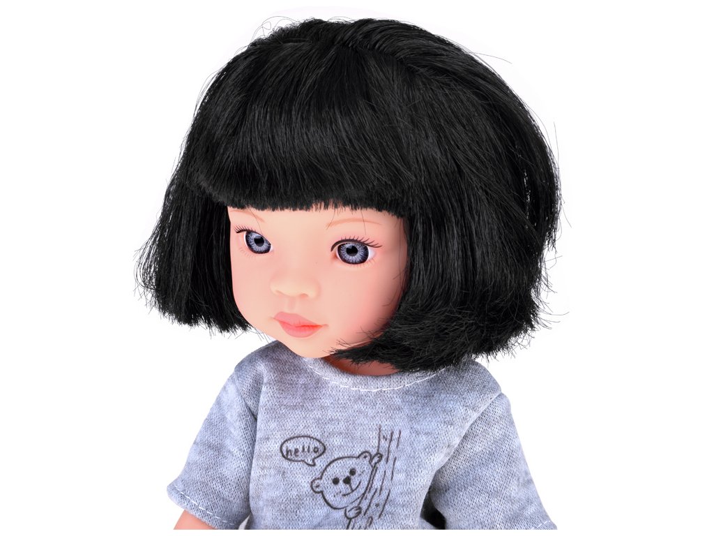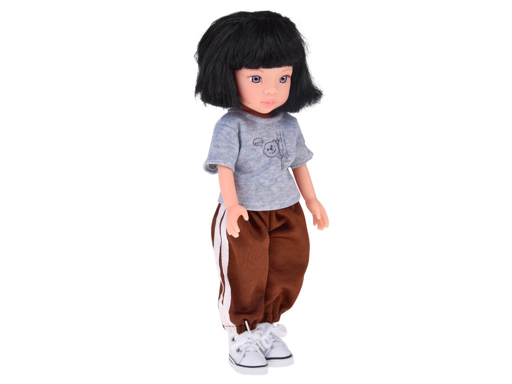Ez a kivételes baba minden kislányt boldoggá tesz! Rövid, sűrű, fekete haja van egyenes frufruval, amely fésülhető és különféleképpen formázható. Kényelmes szürke, mintás pólót, barna melegítőnadrágot fehér csíkokkal és fehér sportcipőt visel fűzővel. Stílusa ötvözi a modernitást és a kényelmet, ideális az aktív mindennapi kalandokhoz.