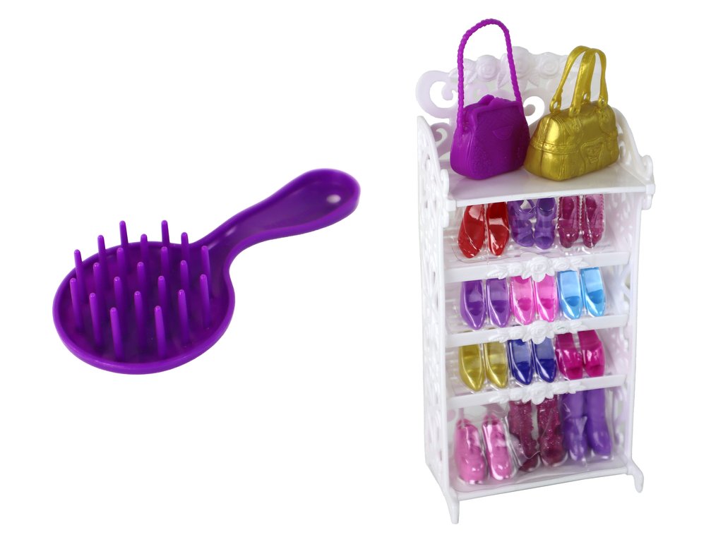 A babához tartozik még egy doboz cipőkkel és kézitáskákkal . Ebben a bájos szekrényben 12 különböző pár elegáns babacipőt tárolhatsz, amelyek különböző alkalmakra és stílusokra alkalmasak. A cipők különböző színűek, így a gyermek különböző ruhakombinációkat készíthet babájának.