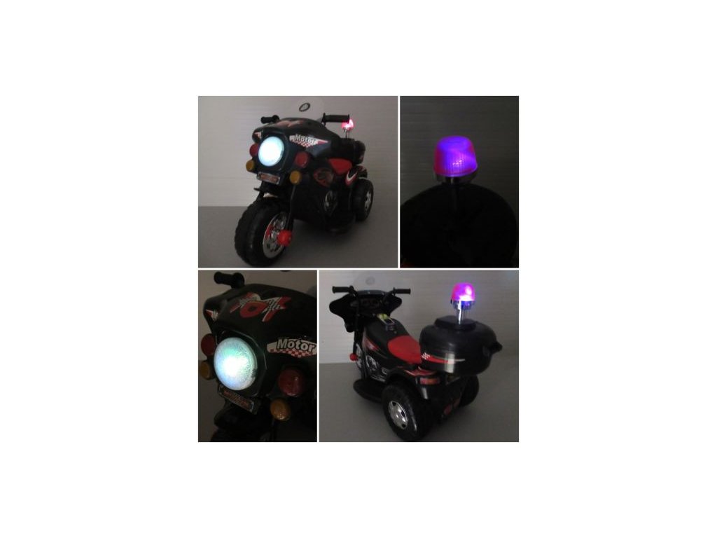 A gyerek elektromos motorkerékpár felszerelése egy elülső lámpát és egy zenepanelt tartalmaz előre felvett dallamokkal. A motorkerékpár nagyon könnyen kezelhető - csak nyomja meg a gázpedált, és a jármű lassan elindul.