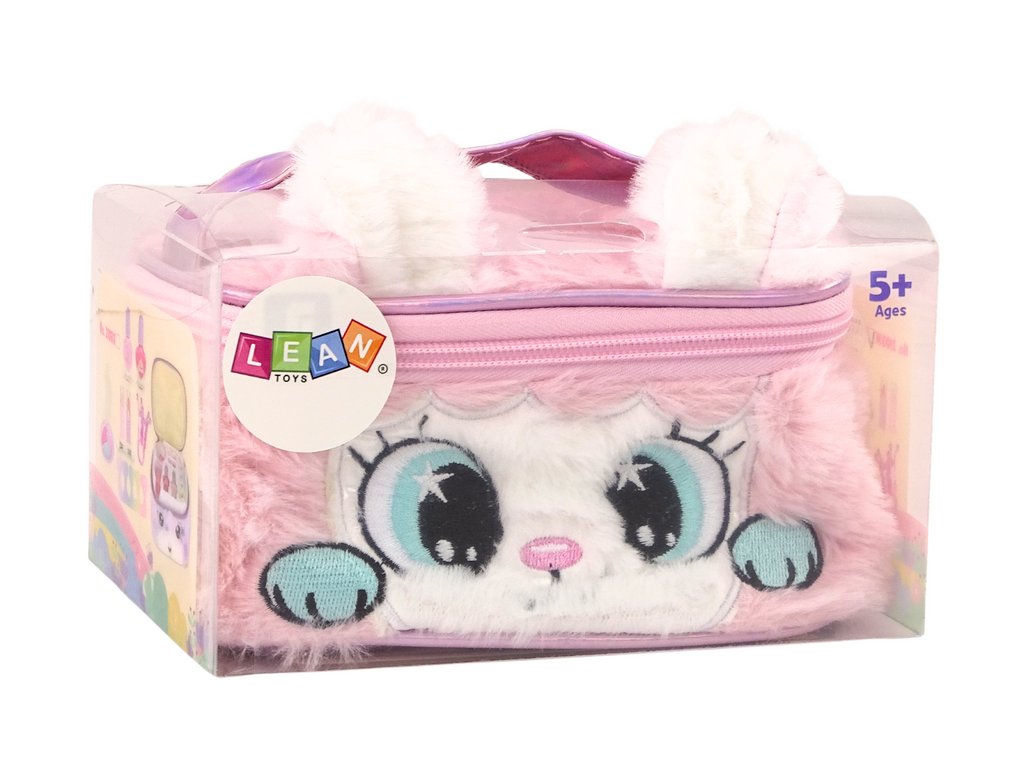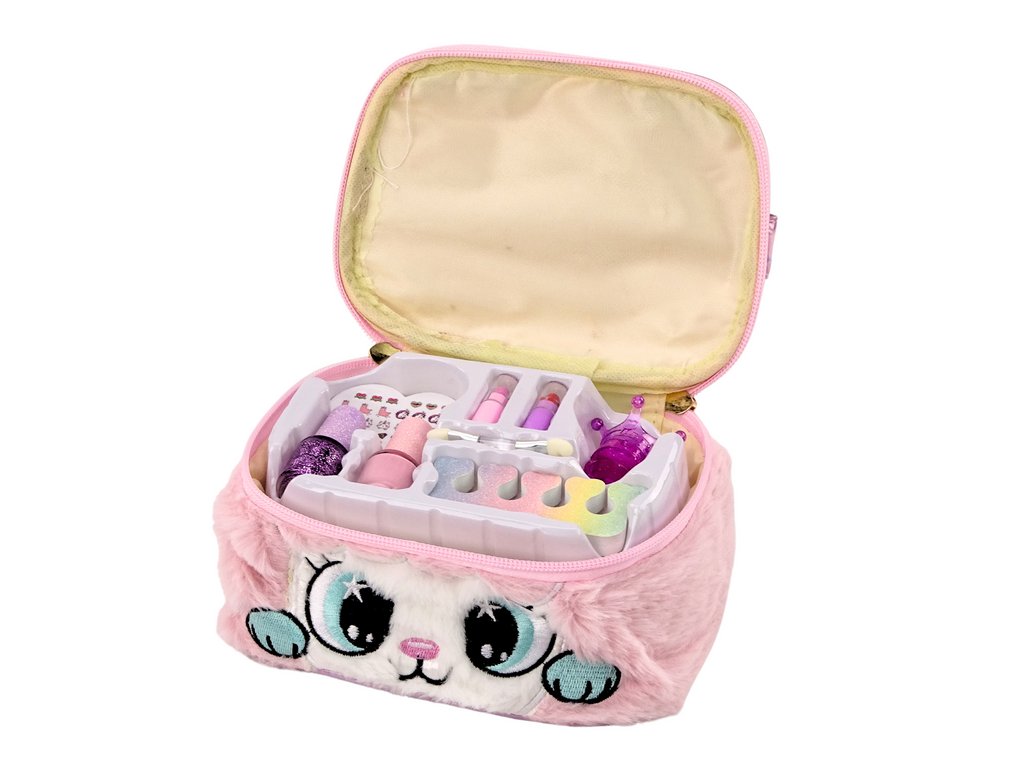 Egy kozmetikai szett egy imádnivaló kozmetikai táskában minden kis smink- és szépségkedvelő álma. A puha plüss anyagból készült, pasztell rózsaszín és kék árnyalatú, macska motívumú kozmetikai táska nem csak praktikus, de varázslatos hely a kozmetikumok tárolására is.