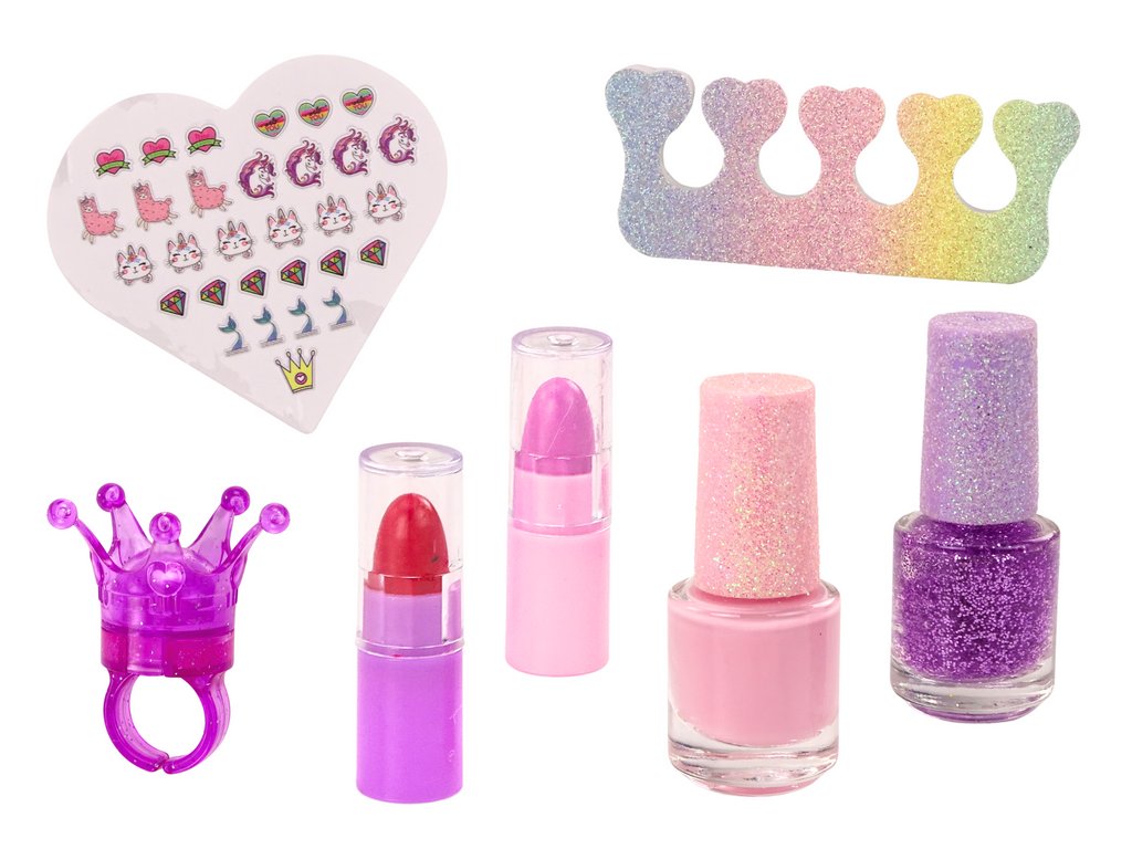 A kozmetikai táska belseje igazi kincseket rejt minden kis hölgy számára. Két körömlakk, egy szeparátor, körömmatricák, egy szemhéjfesték ecset, két kis rúzs és egy gyönyörű, korona alakú szájfény gyűrű mind-mind egy komplett készletet alkotnak a stílusos szórakozáshoz.