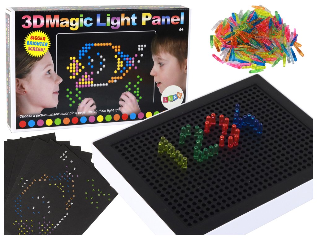 Helyezze a csapokat a táblára, helyezze be a megfelelő lyukakba, és állítsa össze saját 3D-s konstrukcióit. A varázslatos pillanat akkor következik be, amikor megnyomod a tábla hátulján lévő gombot – az alkotásod világítani kezd! Hozzon létre egyedi projekteket, vagy merítsen ihletet a mellékelt sablonokból.