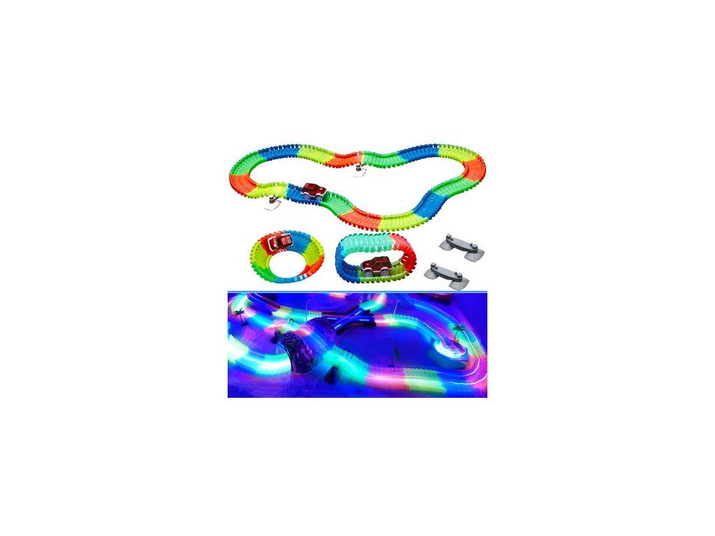 Glow in the Dark: A pálya nyomai foszforeszkálóan világítanak, így a kalandok a sötétben is folytatódhatnak. És ez még nem minden – a készlet tartalmaz egy játékautót is, amely egy AA elemmel működik (nem tartozék). Készüljön fel egy zseniális utazásra!