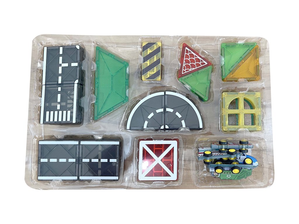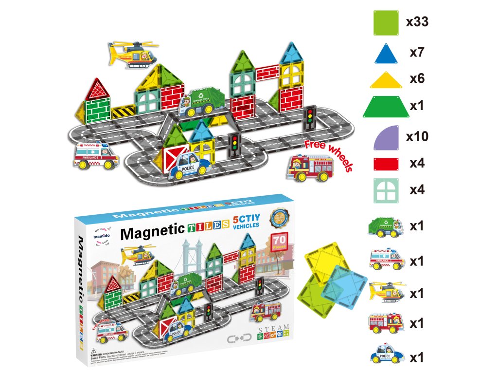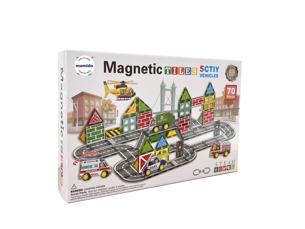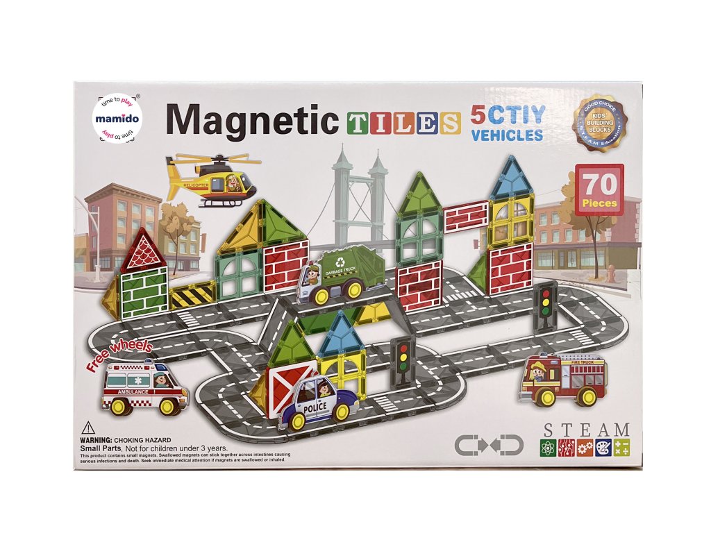Kreatív mágneses építőkocka nagy, 7,5 cm-es darabokkal, lehetőséget adva a gyerekeknek, hogy felépítsék saját városukat, tele házakkal, hidakkal, tornyokkal és utakkal. A városi sorozat 70 darab, különböző formájú, színes mágneses építőelemet tartalmaz, kis járművekkel kiegészítve, amelyek élénk és játékos karaktert kölcsönöznek az építményeknek. Az erős mágnesek biztosítják a szerkezetek stabilitását, és lehetővé teszik a gyerekek számára, hogy folyamatosan új ötleteket találjanak ki.