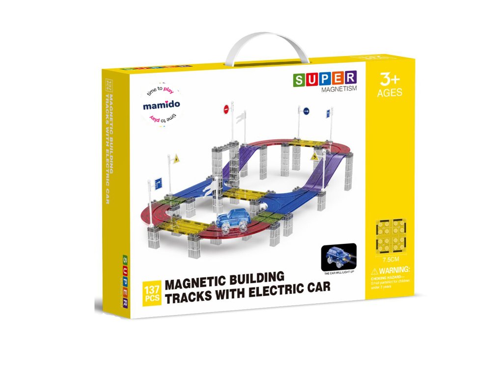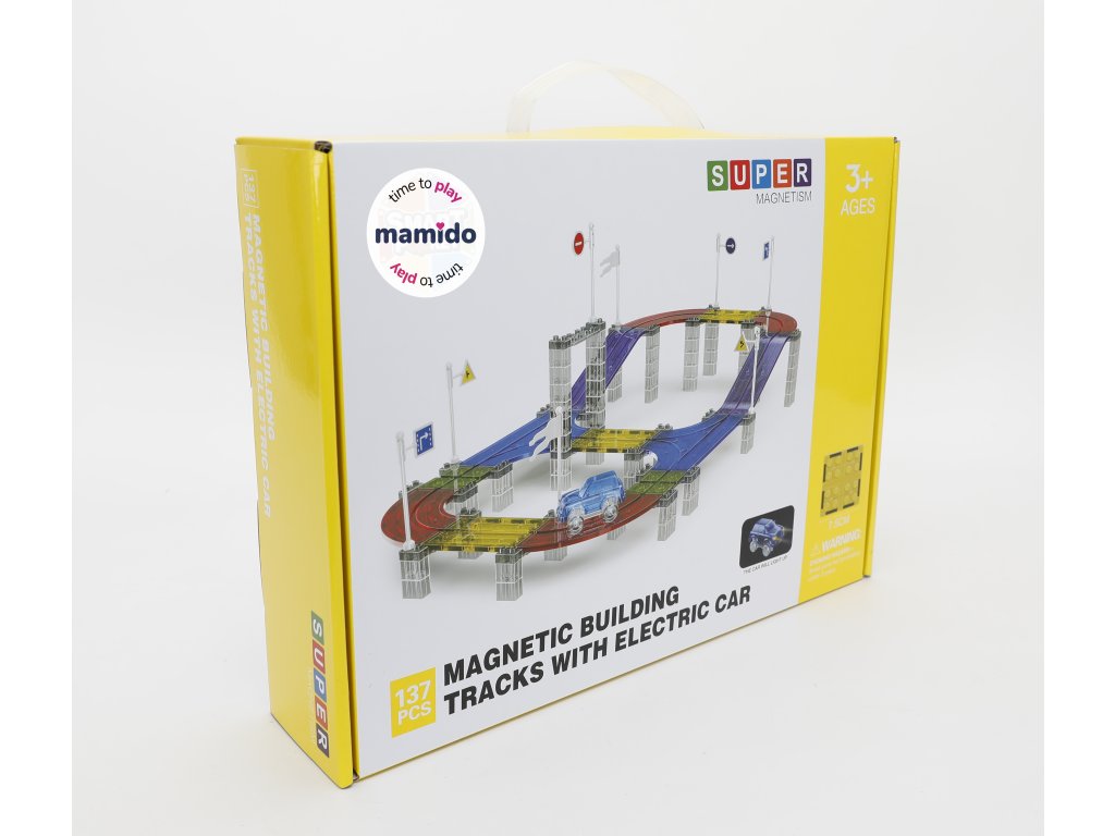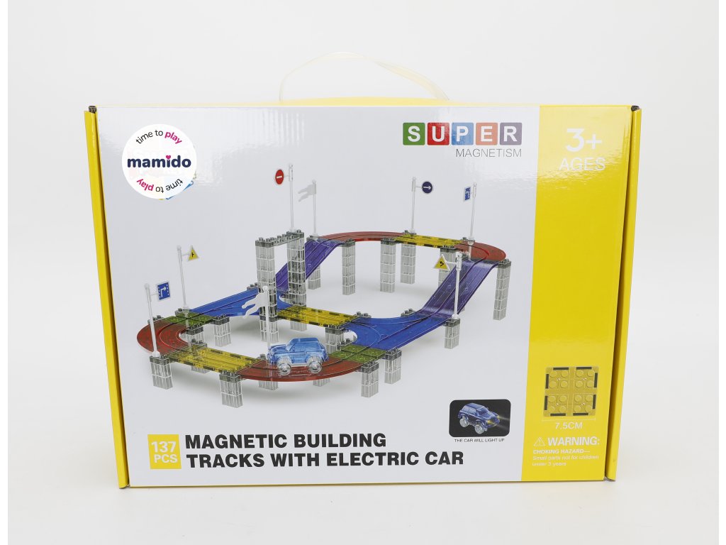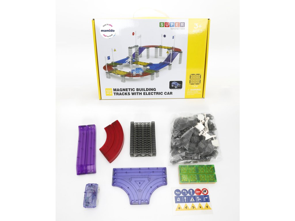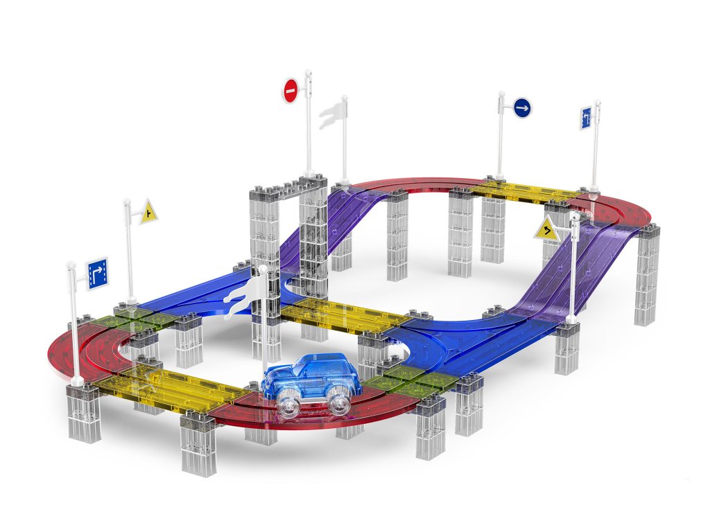 A készlet 137 mágneses elemet tartalmaz, speciális pályaelemeket is. Az erős mágneseknek köszönhetően a panelek könnyen összeilleszthetők, így a gyerekek kísérletezhetnek a pálya formájával és magasságával. Az elektromos kisautó önállóan végigjárja az egész útvonalat, ami nagyszerű mozgásélményt nyújt és fejleszti a technikai gondolkodást.