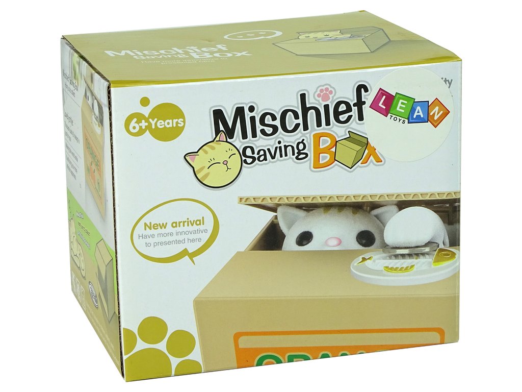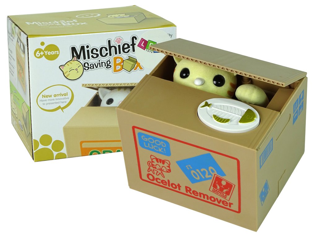 Minden gyerek szereti gyűjteni a megtakarításait. A macska persely még több megtakarításra ösztönzi gyermekét. Nyomja meg a gombot a dobozon, a macska felemeli a fedelet, és a mancsával behúzza a pénzt.