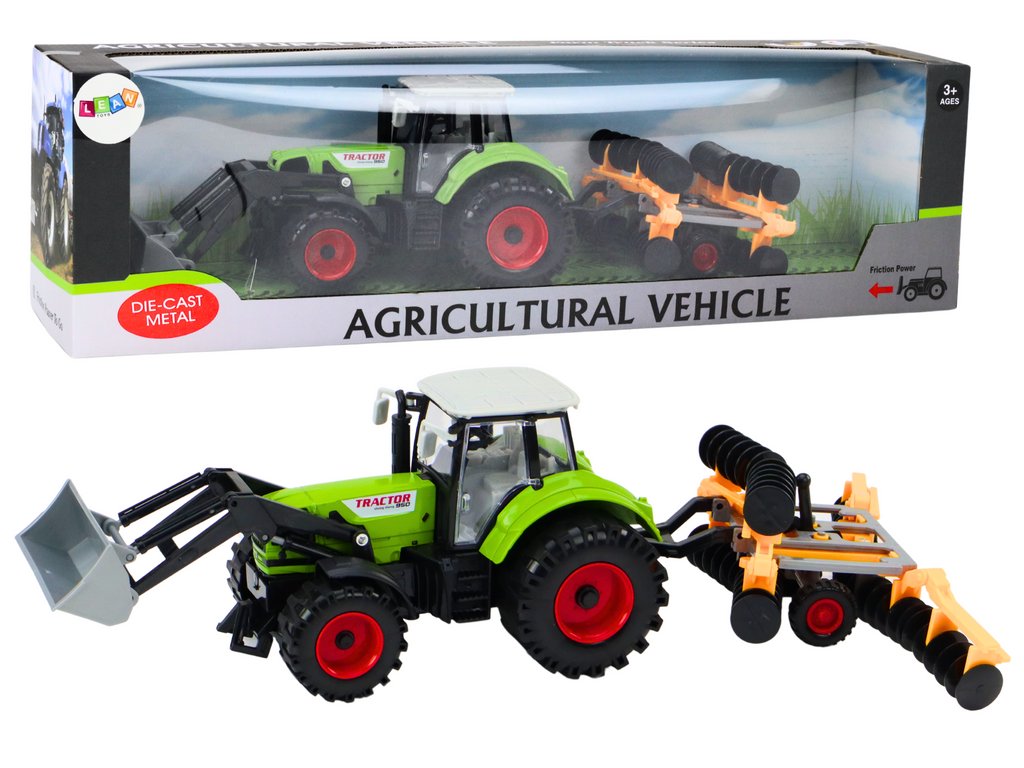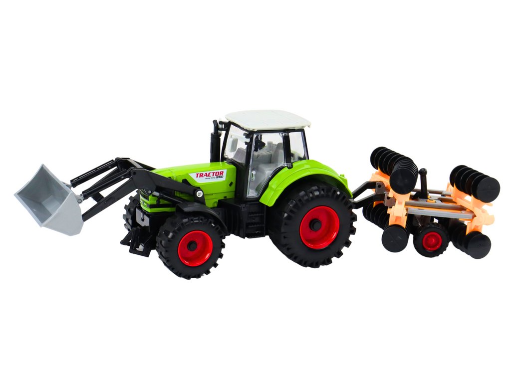 Mezőgazdasági traktor markolóval és tárcsás boronával, zöld