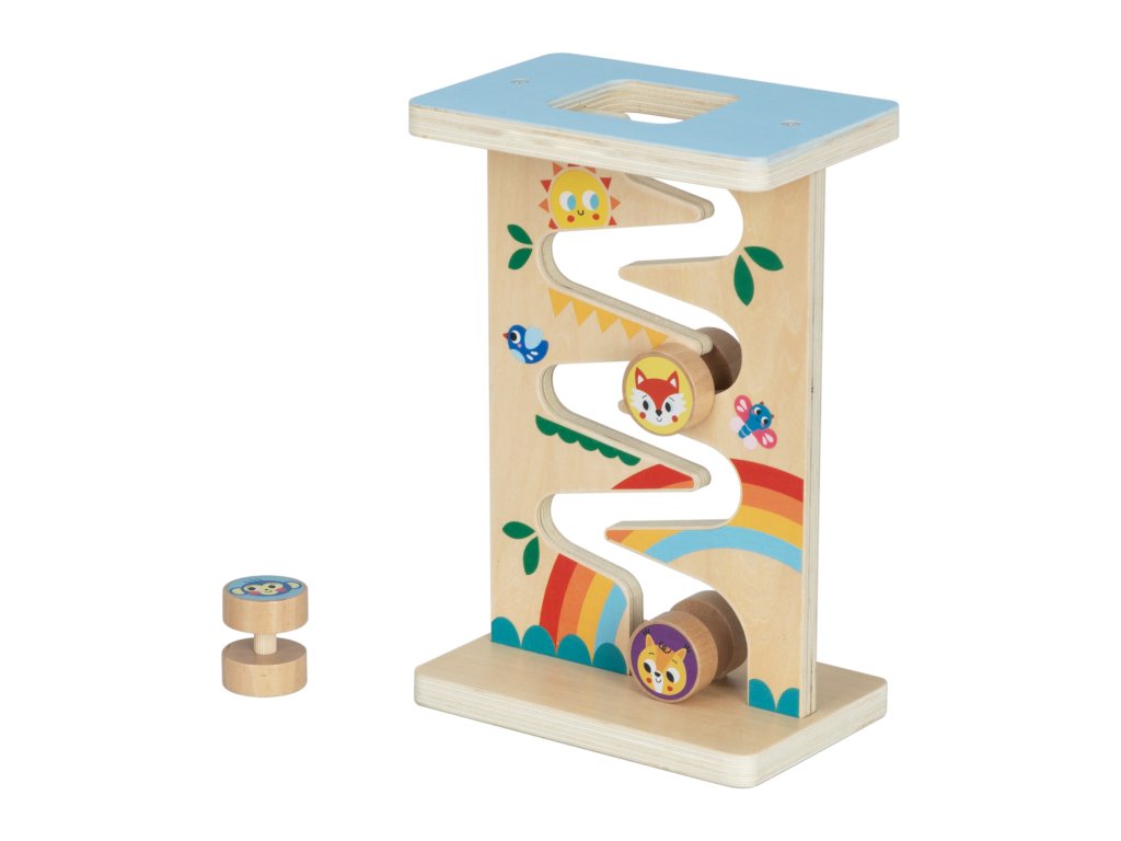 - Egy fából készült pálya, amelyen állatképekkel ellátott görgők csúsznak lefelé.