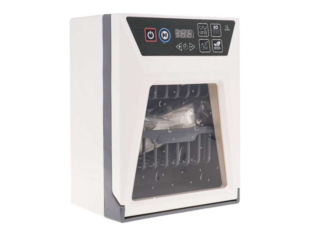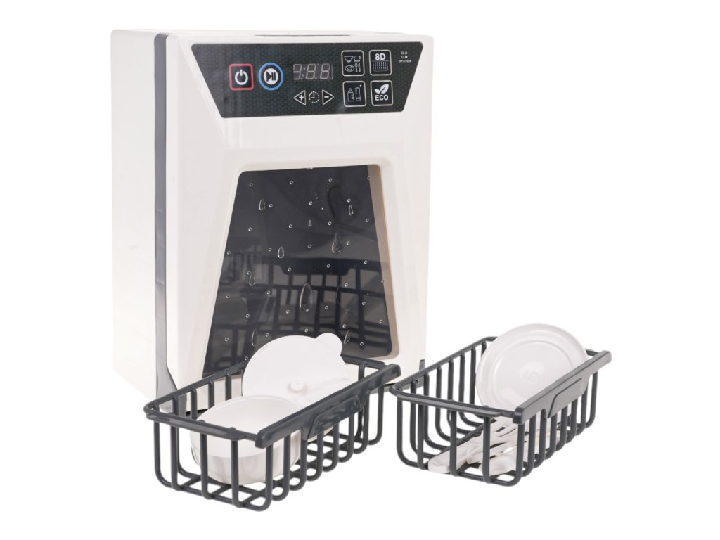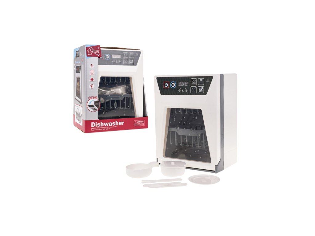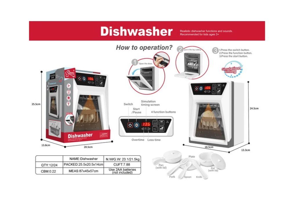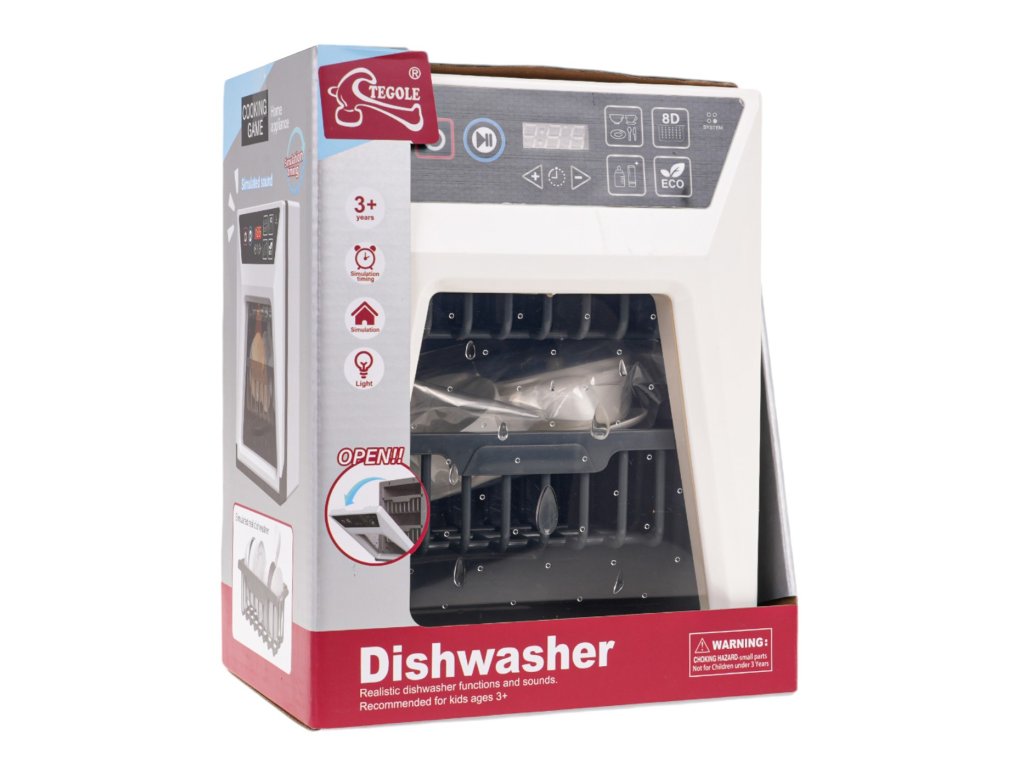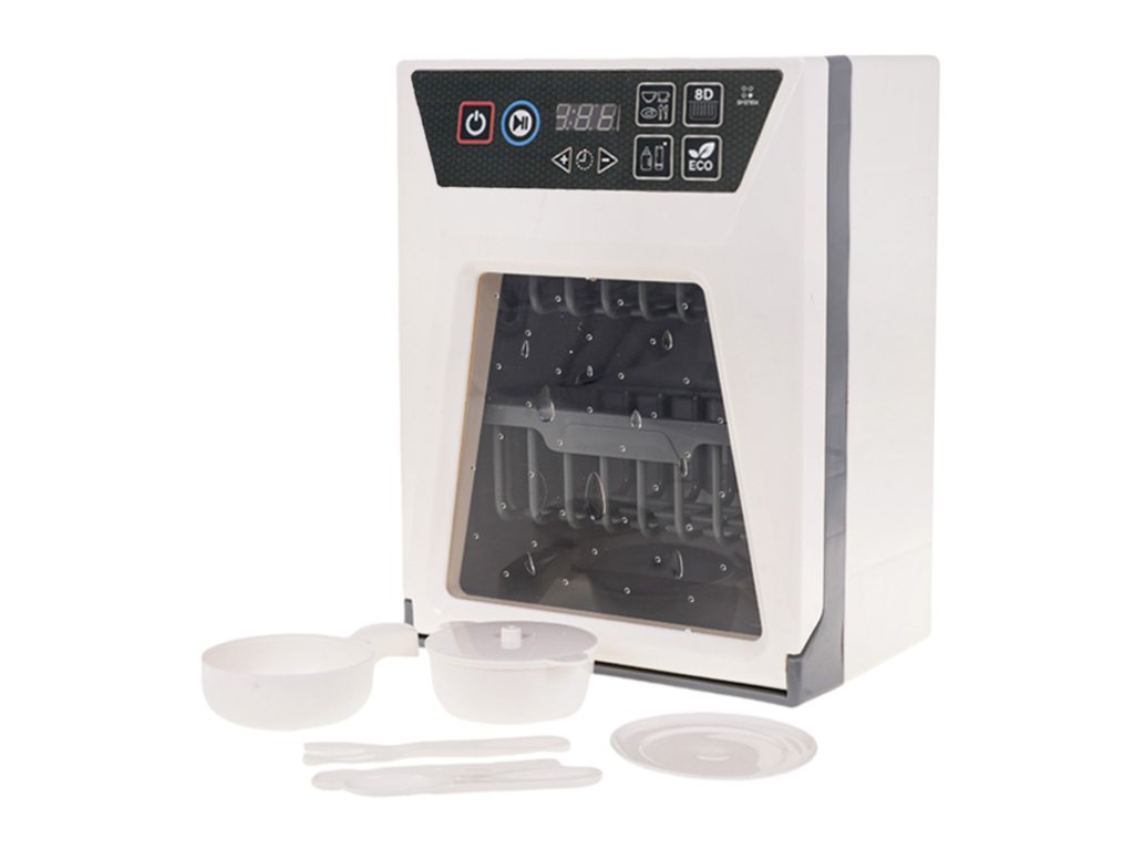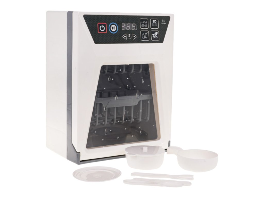 Interaktív mosogatógép hang- és fényfunkcióval gyerekeknek 3 éves kortól . A mosogatógép úgy néz ki, mint az igazi, és jellegzetes hangokat ad ki. A legjobb minőségű anyagokból készült és biztonságos a gyermek számára. A mosogatógép elindításához nyomja meg a piros gombot az érintőpanelen és válassza ki a programot, majd nyomja meg a lejátszás gombot. A mosogatógép a kiválasztott programra jellemző hangokat hallat, és visszaszámol a program hátralévő idejéről. Kinyílik a mosogatógép ajtaja, és belülről kivehetjük a mosogatógép fiókját. A csomag számos edényt és evőeszközt tartalmaz.