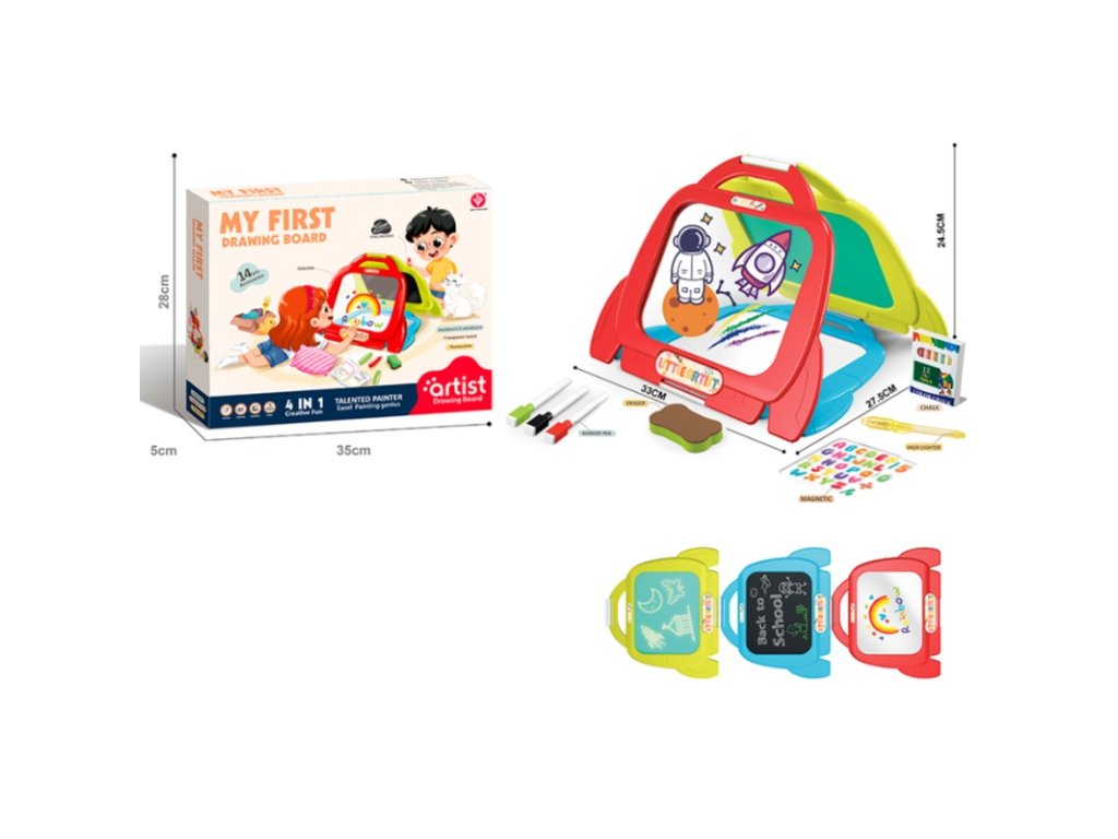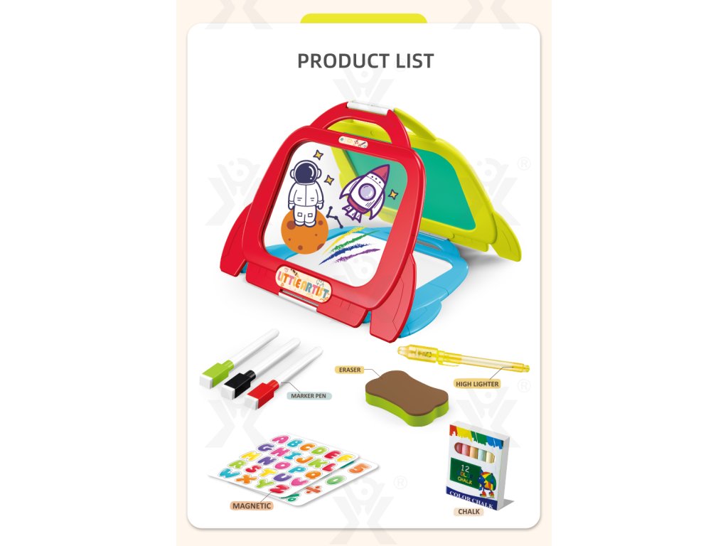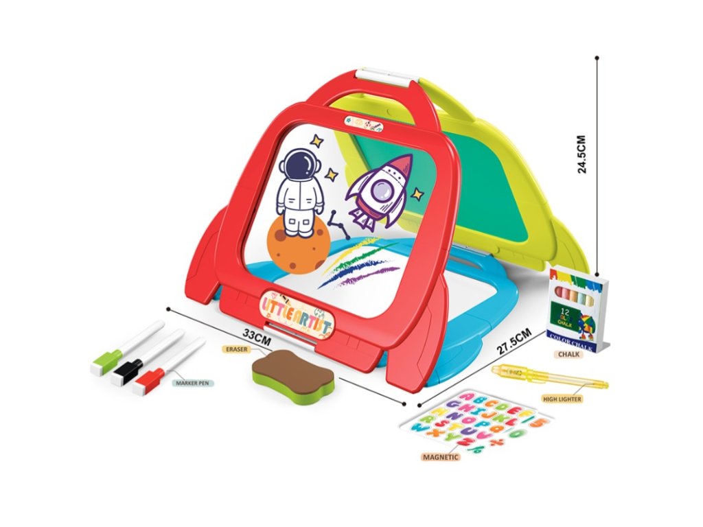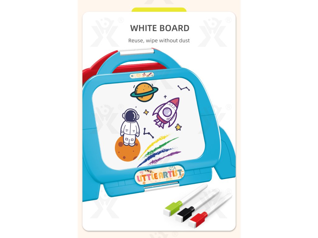 A kétoldalas rajzolási lehetőséggel ellátott, többfunkciós tábla minden rajzolni szerető kisgyereket boldoggá tesz, és barátját is játékra hívhatja. A tábla egyik oldalán jelölőkkel lehet rajzolni, míg a másik oldalon a mellékelt ceruzát használhatjuk. A rajzok könnyen eltávolíthatók az alján található csúszkával. Ezen kívül 2 oldalt kicsúsztatható fiókkal vannak felszerelve, amiben a mellékelt tárgyak tárolhatók.