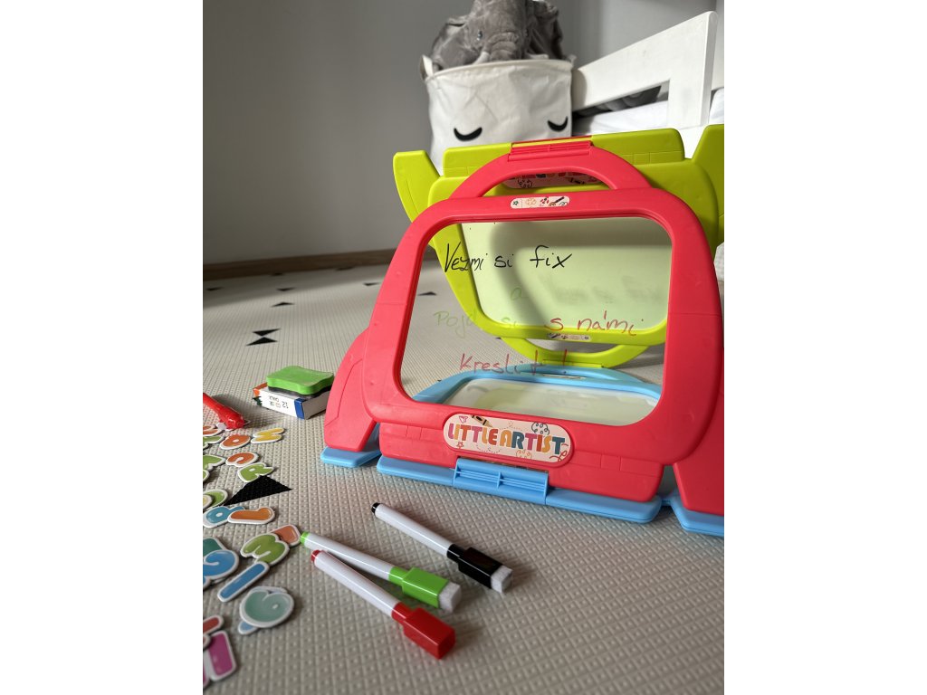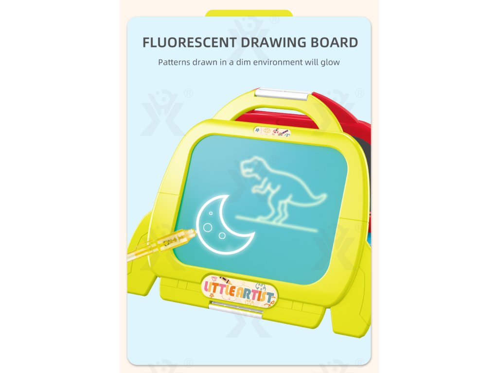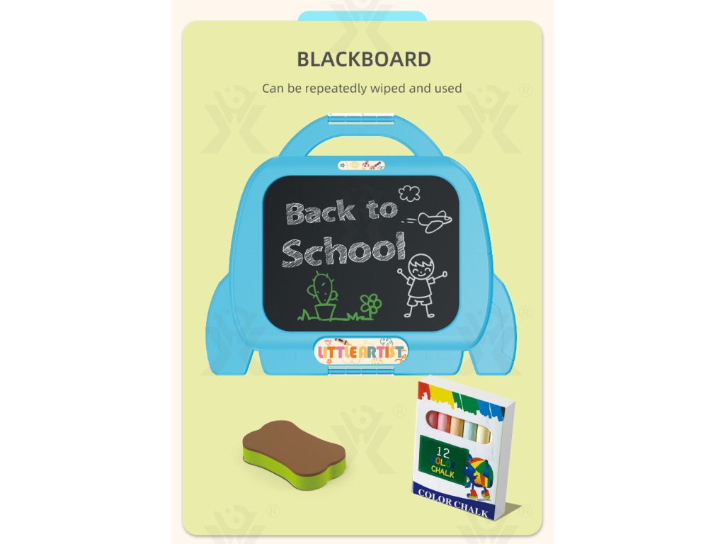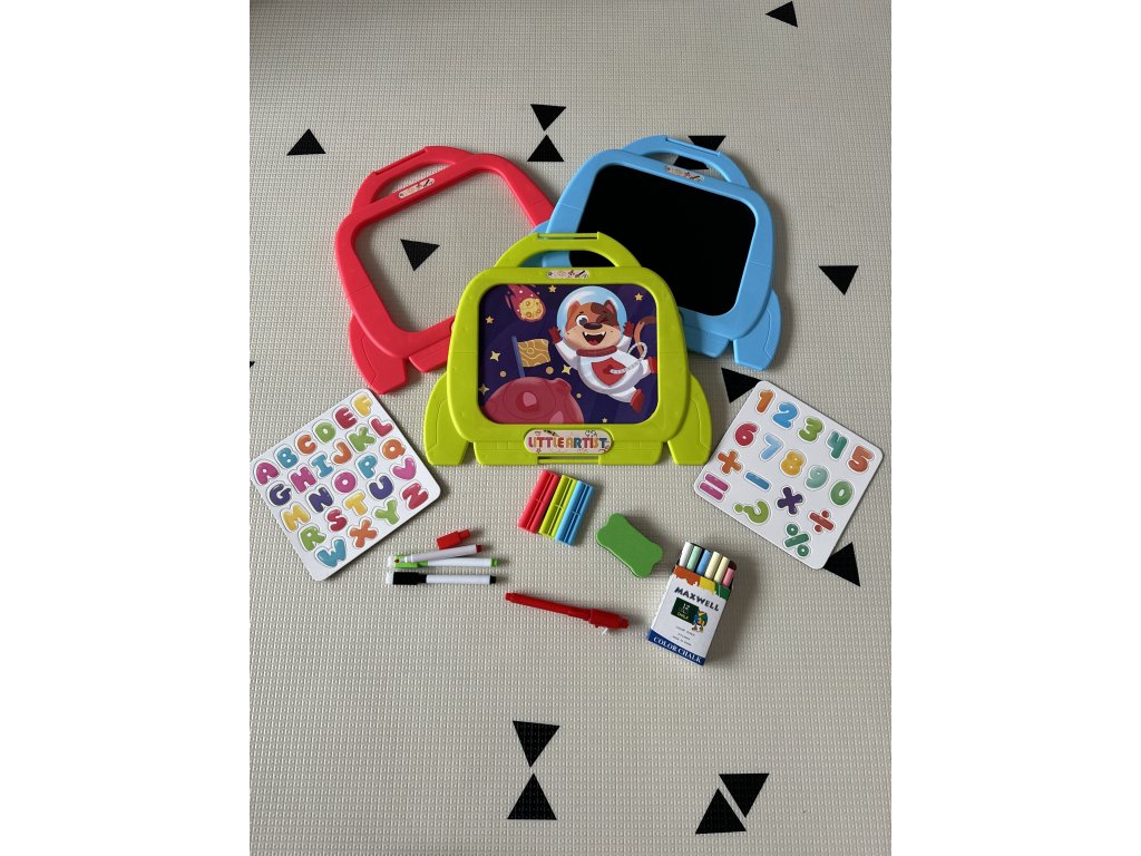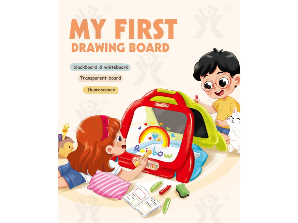 A kétoldalas rajzolási lehetőséggel ellátott, többfunkciós tábla minden rajzolni szerető kisgyereket boldoggá tesz, és barátját is játékra hívhatja. A tábla egyik oldalán jelölőkkel lehet rajzolni, míg a másik oldalon a mellékelt ceruzát használhatjuk. A rajzok könnyen eltávolíthatók az alján található csúszkával. Ezen kívül 2 oldalt kicsúsztatható fiókkal vannak felszerelve, amiben a mellékelt tárgyak tárolhatók.