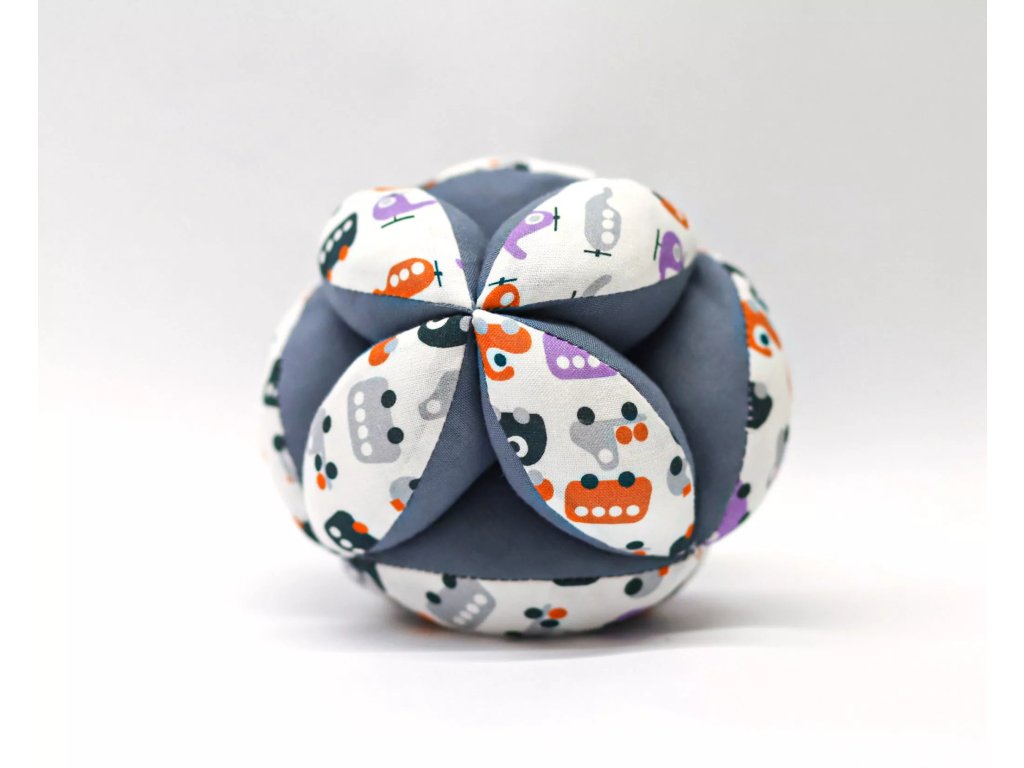 A labda kiemelkedő panelekkel van ellátva, amelyek lehetővé teszik a könnyű megfogást a kis kezek számára. Mozgás közben finom csengőhangot ad ki a belsejében elhelyezett csengő. A kontrasztos, élénk színek növelik a gyermek vizuális ingereit.