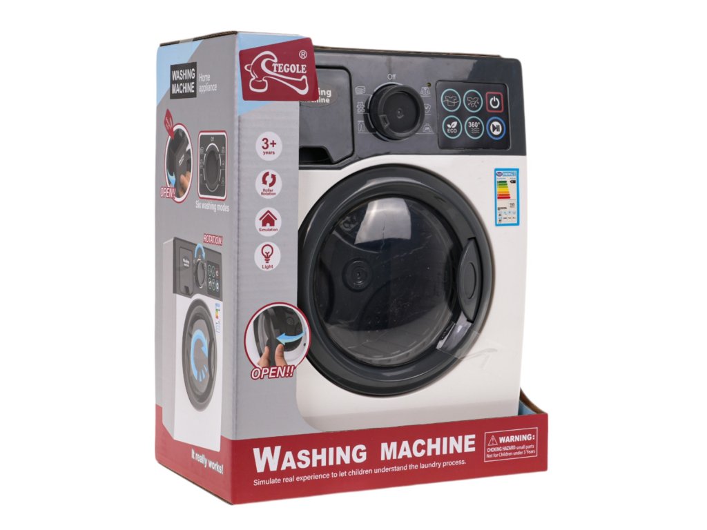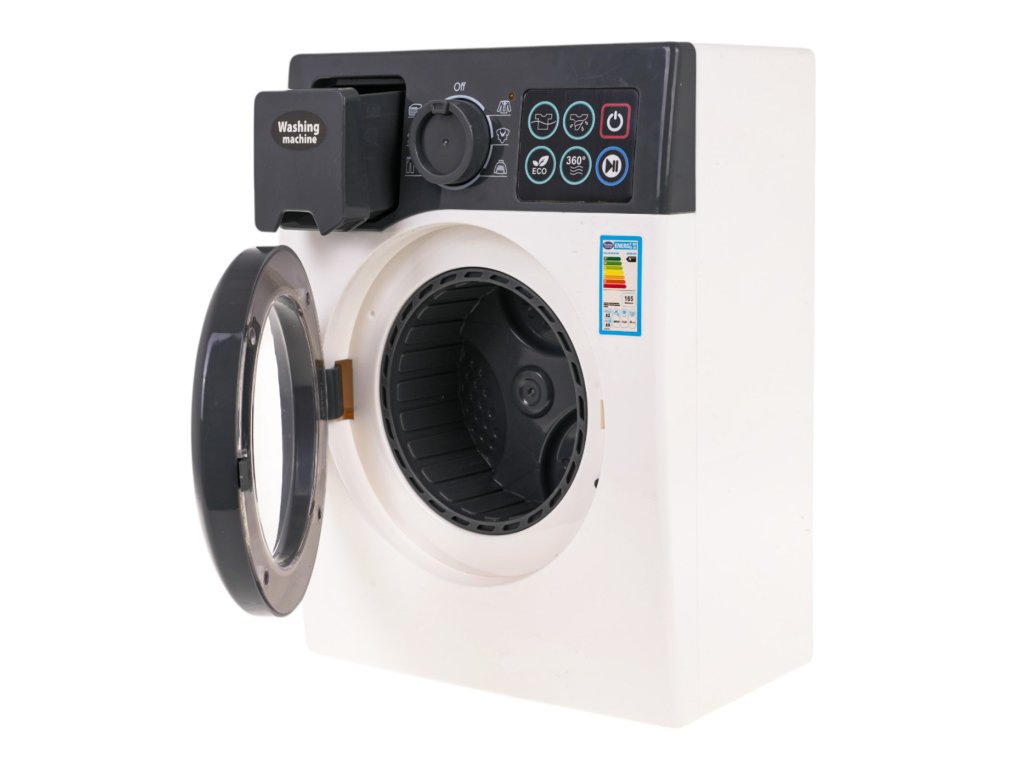 Interaktív mosógép hang- és fényeffektusokkal gyerekeknek 3 éves kortól . Egy mosógép, amely nem csak úgy néz ki, mint az igazi, de hatékonyan utánozza is. A mosógép ajtaja kinyílik és záródik, a dob forog. Például a baba ruháit beteheti a mosógépbe, de vigyázzon, hogy ne öntsön bele vizet. A mosógép felső részén található egy panel a mosógép vezérléséhez . A piros gombbal indítjuk a mosógépet és a gombok és a tekerőgomb segítségével tetszés szerint váltogathatjuk a mosóprogramokat. Minden mosási program különböző hangokat ad ki. A mosógép bal felső sarkában van egy kihúzható fiók a "mosópor" számára.