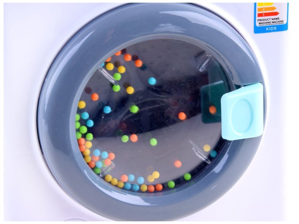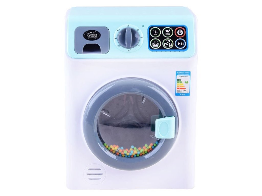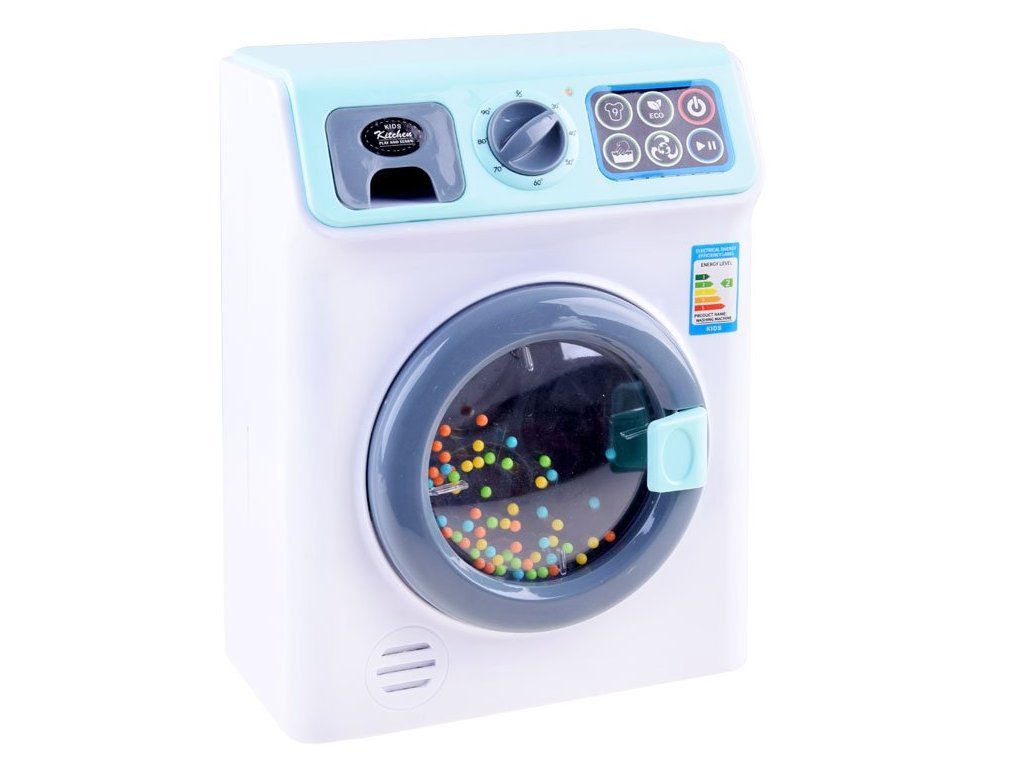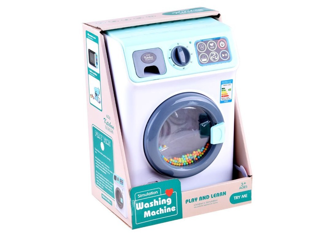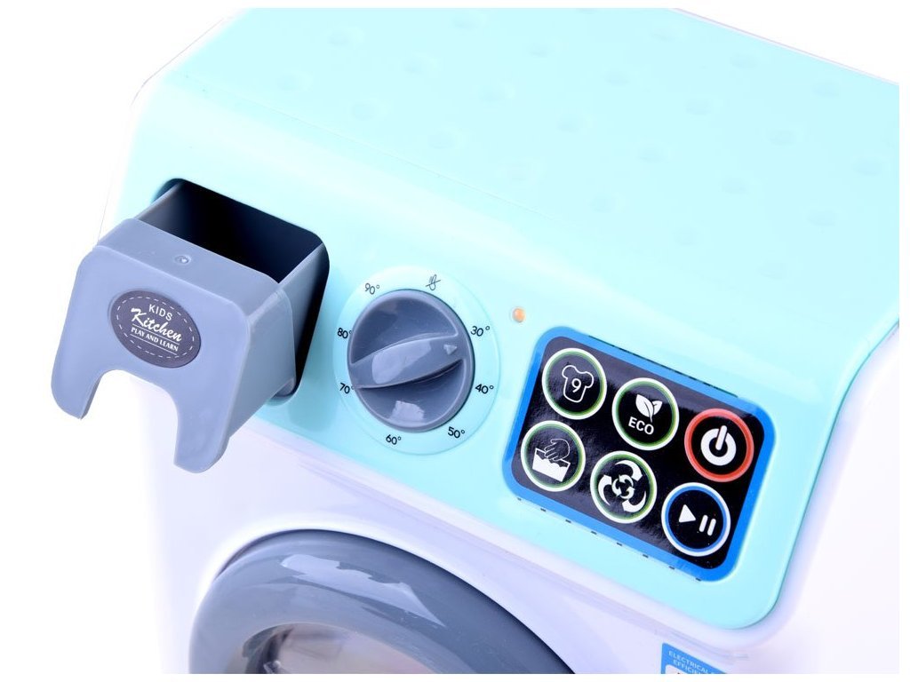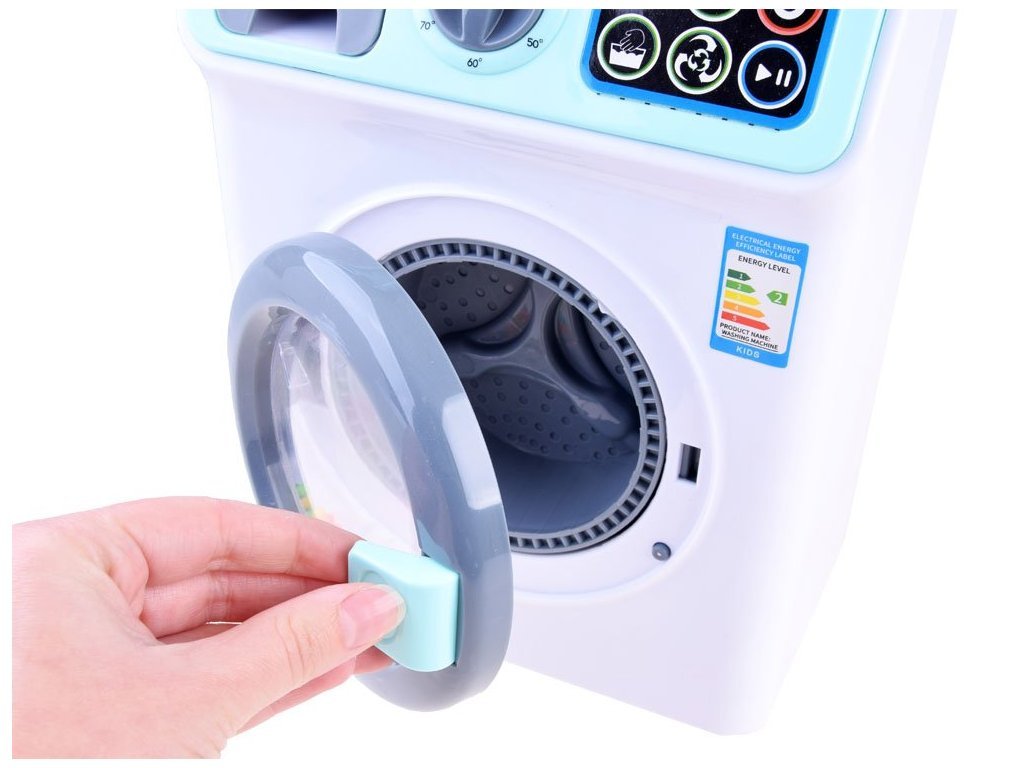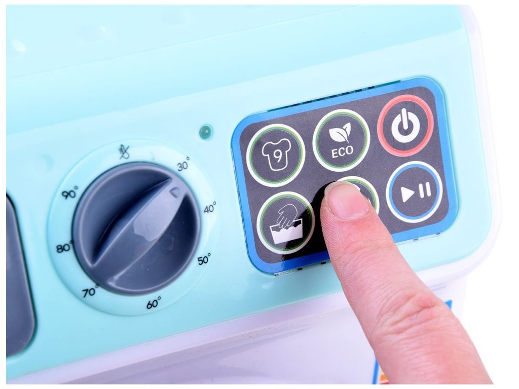 A baba mosógép úgy néz ki és hangzik, mint az igazi. A mosógép érintőpanellel kiválasztható a mosási programok, és a ciklustól függően különböző mosógép hangokat fog hallani, és a játék elején lévő LED lámpák világítanak. Oldalán egy mozgatható gomb található a hőmérséklet változtatásához.