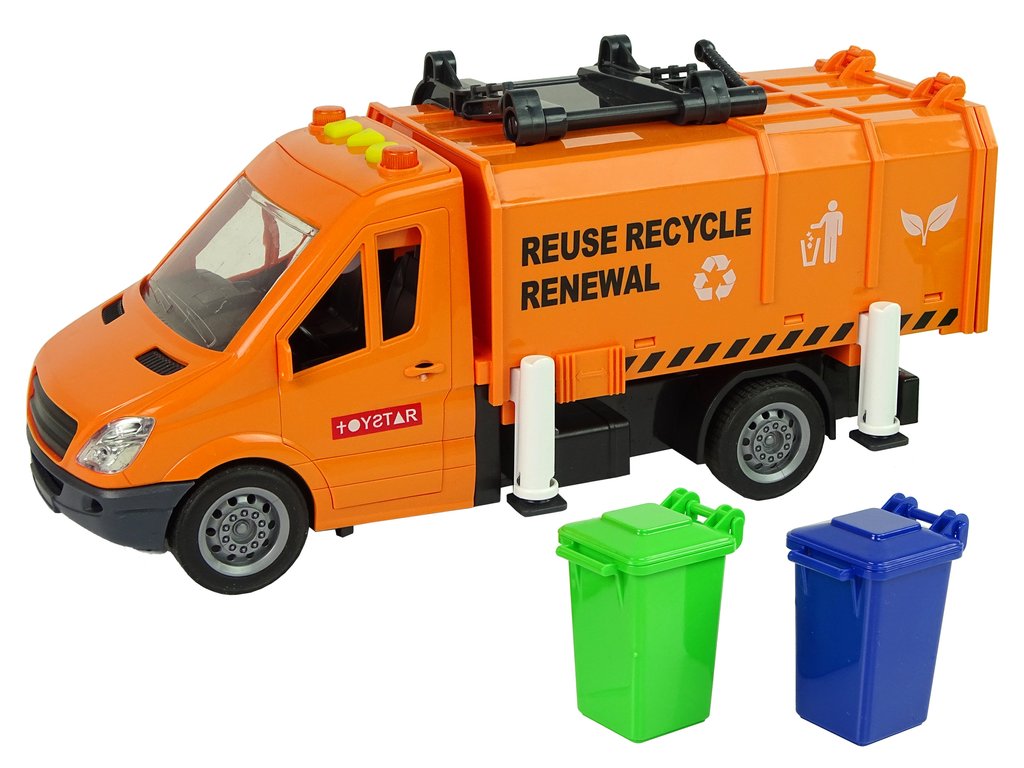 A kukásautó hűen van visszaadva, a narancssárga szín nagyon ötletes. A csomag műanyag kosarakat is tartalmaz, amelyekbe apró tárgyakat lehet dobni. Az autó dörzshajtású, a nyitható raktér lehetővé teszi a hulladék megfelelő helyre történő kidobását. Egyszerűen rögzítse a kosarat a létrához, és húzza meg a kart, hogy felemelje a kosarat, és kiöntse a tartalmát a csomagtérbe.