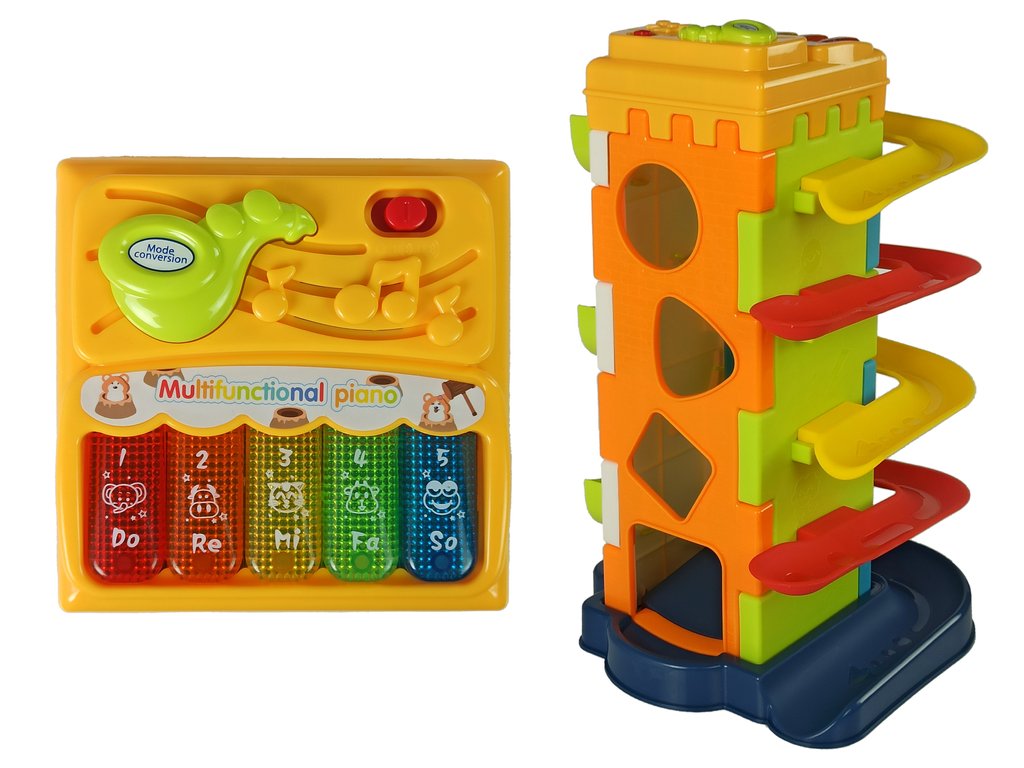 Helyezze be a golyókat az első platformon lévő lyukba, és hagyja, hogy szabadon csúszhassanak a padlón, és lezuhanjanak. A másik falon egy válogató található, amibe a gyerek elhelyezheti a megfelelő tömbformákat.