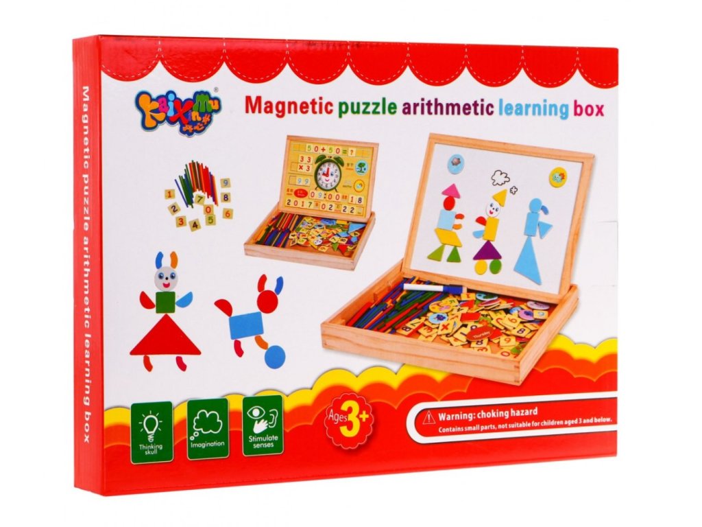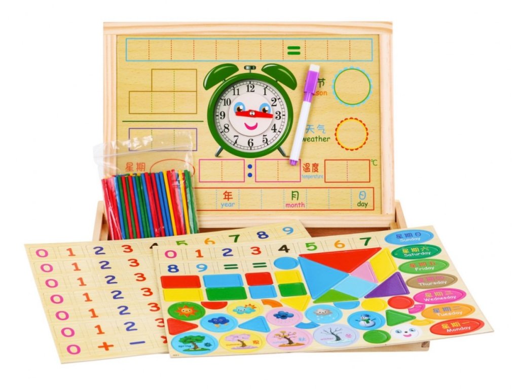 A mágneses fatábla oktatási kiegészítőkkel egy oktató játék 3 éves kortól. A gazdagon felszerelt készlet nagyon sokáig foglalkoztatja gyermekeit. Ennek a készletnek köszönhetően a gyermek megtanulja a számokat, az összeadást, kivonást, szorzást és osztást, a hét napjait, évszakokat, geometriai alakzatokat, időjárást, órát és szorzótáblát. A készlet ideális tanulási segédlet és fejleszti a művészi készségeket.