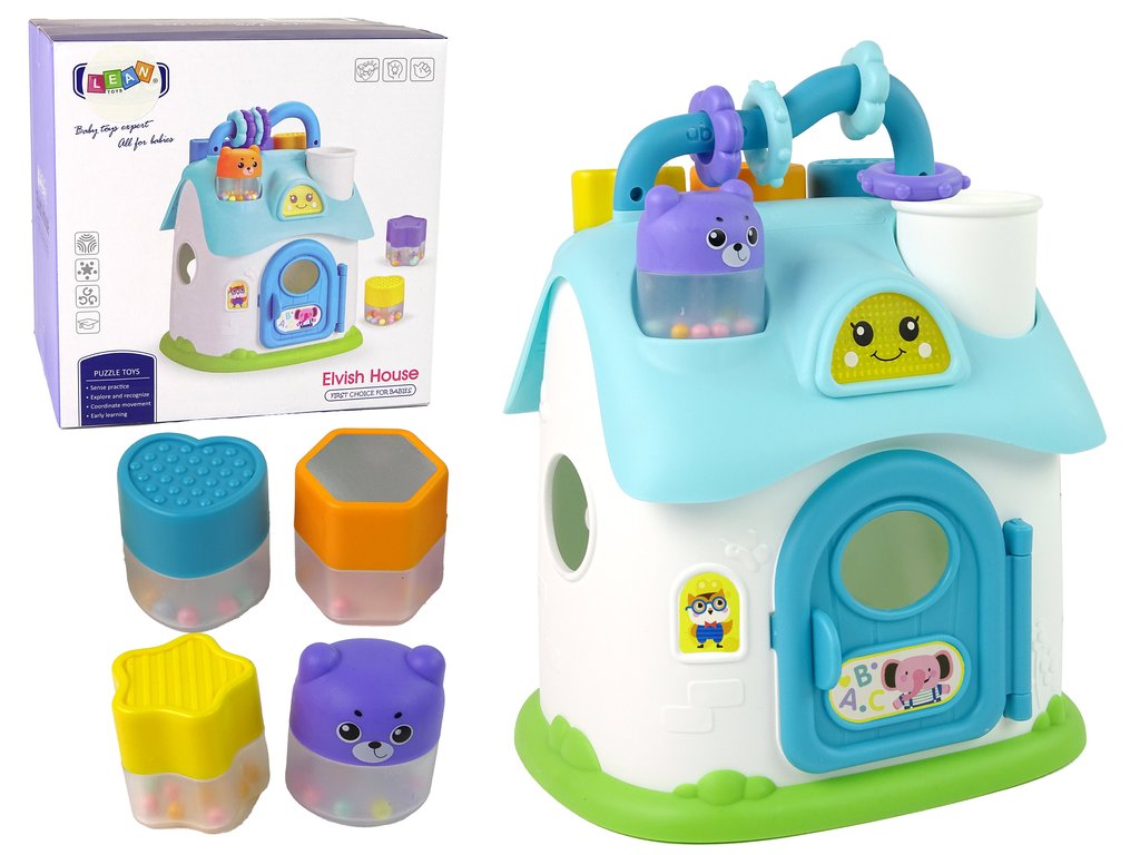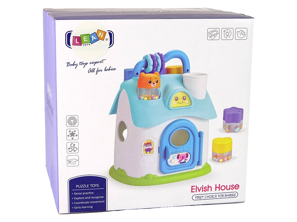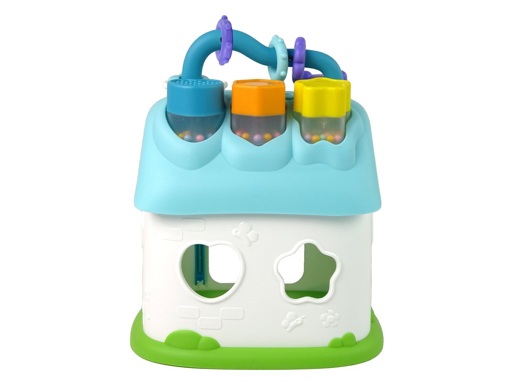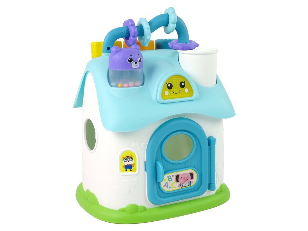 A játék kék-fehér ház alakú. Van egy fogantyúja, amelyen négy különböző karika található, amelyek egyik végéről a másikra mozgathatók. Az oktatóházhoz fehér kémény is tartozik, amivel a készlet részét képező kockákat ki lehet engedni.