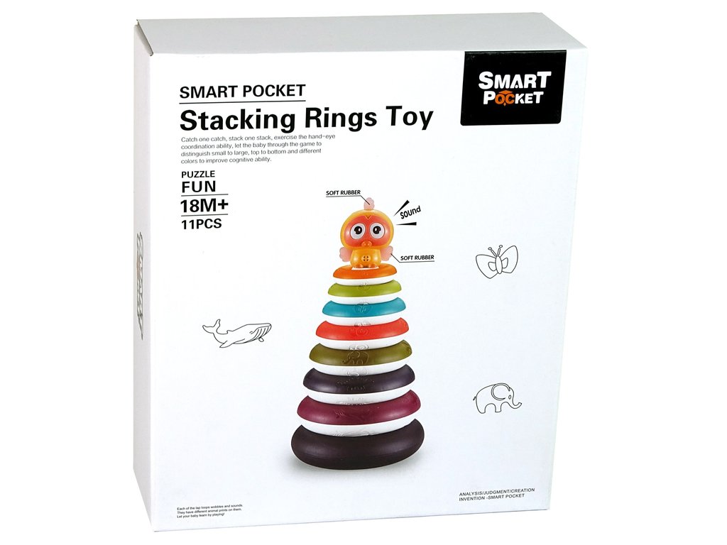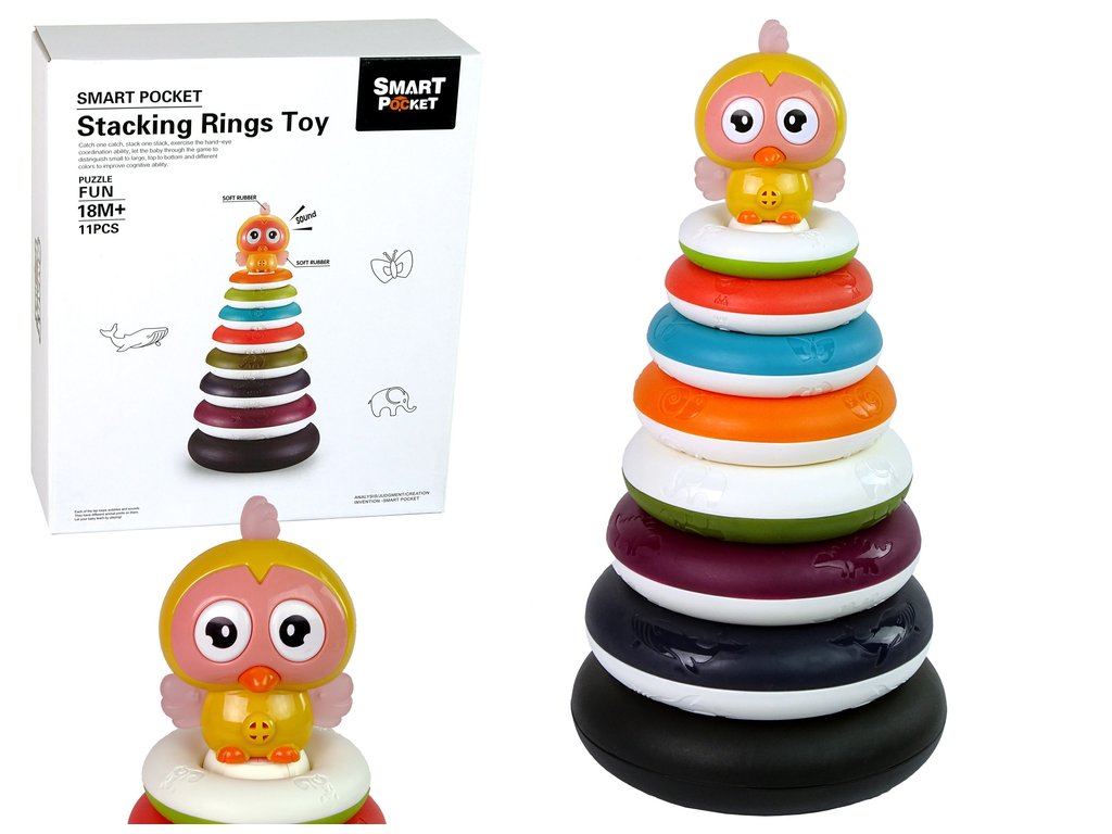 - A készlet többféle, különböző méretű gyűrűből áll. Az egyik lehetőség, hogy a gyűrűket a gyermek fantáziája szerint rendezzük el. A piramis tetején álló sárga kiskacsa zörgéssel változatossá teszi az egész játékot. Szárnyai puha gumiból készültek, ami foghúzóként is használható. Az állatokkal díszített színes dizájn segít gyermekének fejlődni és megismerni az őt körülvevő világot. A piramison a megfelelő gyűrűknek megfelelő állatok képei is vannak. A torony építése közben a gyerkőc megtervezheti a képeket.