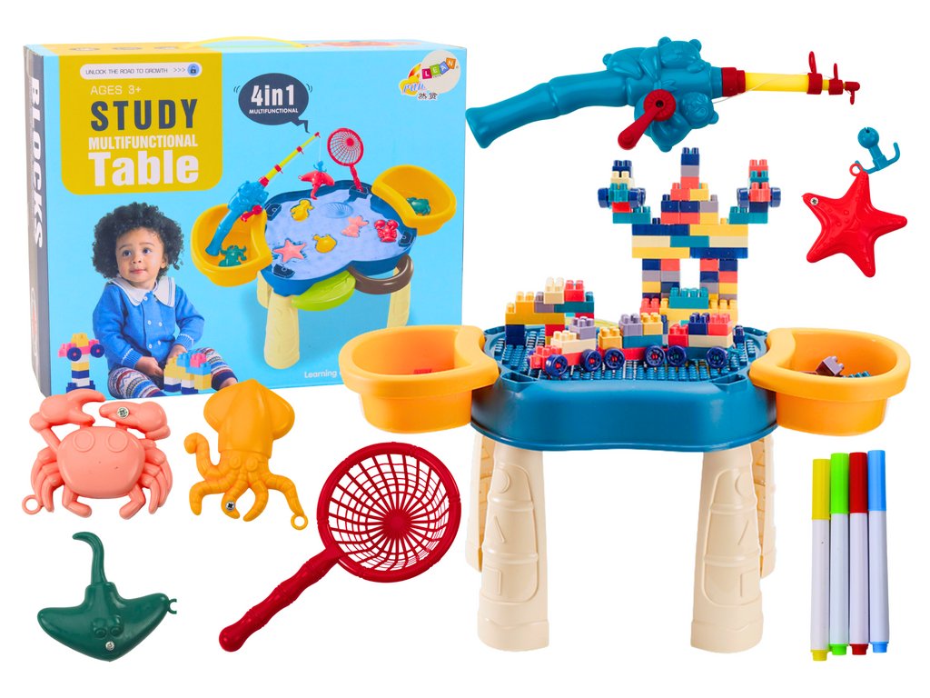 A 4 az 1-ben többfunkciós asztal tökéletes játékközpont a gyermekek számára, amely a szórakozást az oktatással ötvözi. A csomag építőkockákat, horgászbotot és csavarkészletet tartalmaz, amelyek kreatív játékra és finommotorikára ösztönöznek. A gyerekek az építéstől a horgászatig váltogathatják a tevékenységeket, ami fejleszti logikus gondolkodásukat és képzelőerejüket.