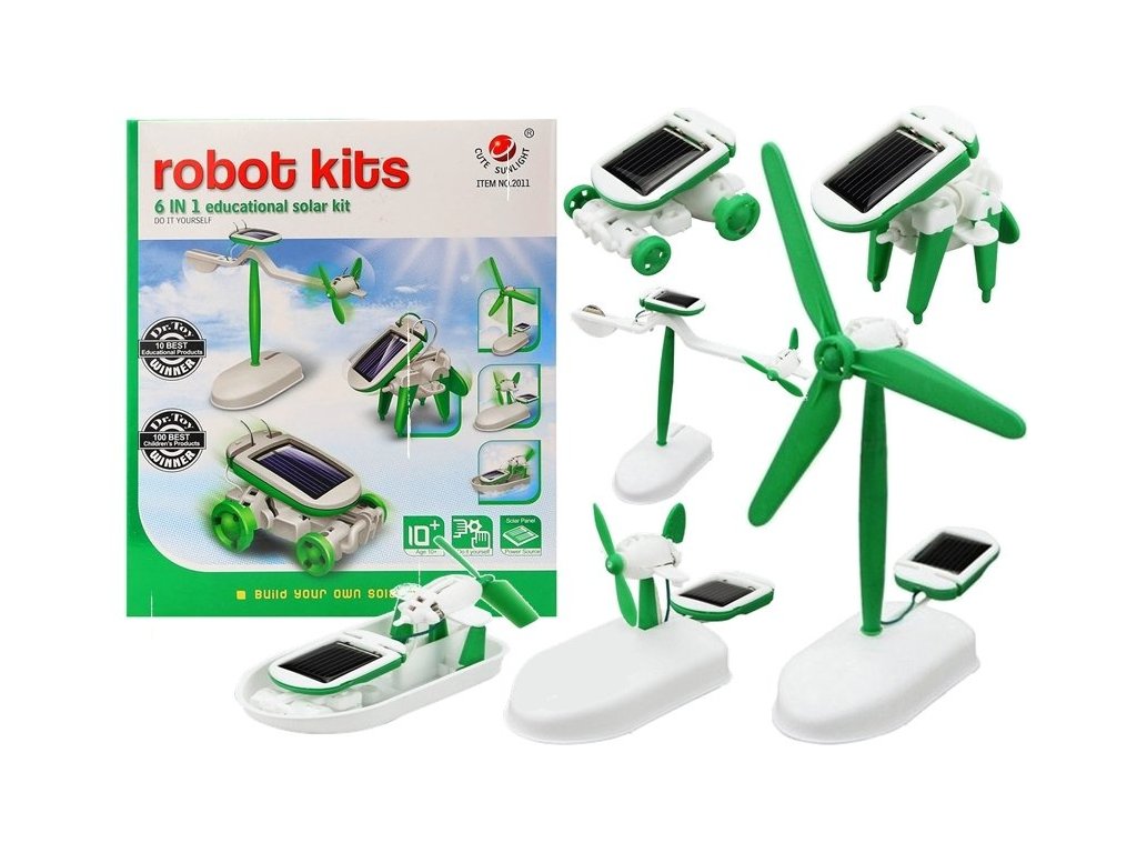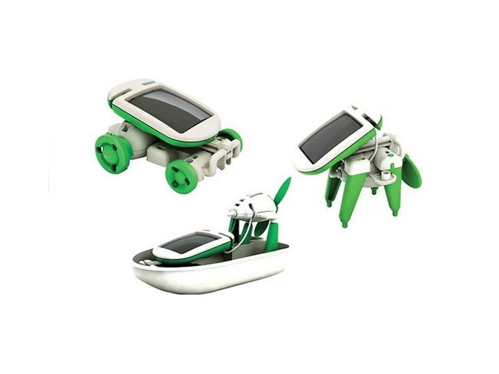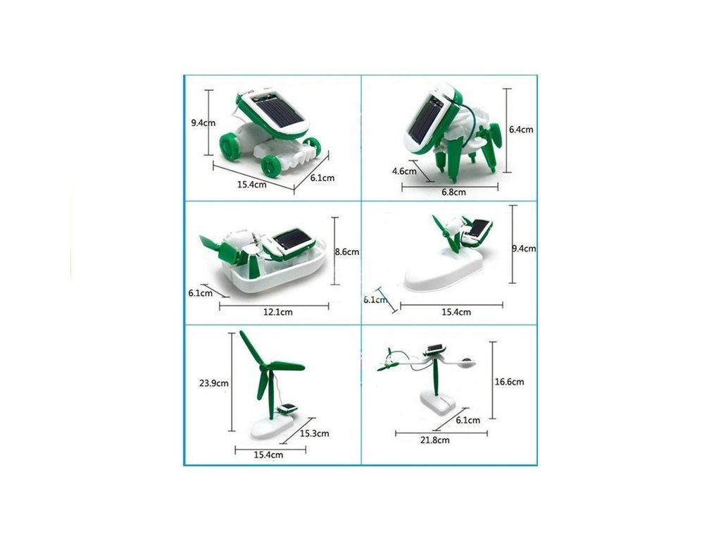 A Solar Robot 6 az 1-ben kreatív készlet A Solar Robot egy oktató és interaktív játék, amely egyszerre szórakoztat és tanít. Ideális ajánlat egy kis ökológusnak és mindenekelőtt a világra kíváncsi gyerekeknek. A 6 az 1-ben készlet nemcsak szórakoztató az építési tesztekhez, hanem tanulságos is. A készlet tartalma: - szerkezeti elemek, - elektronikai alkatrészek, - napelem, - illusztrált játék kézikönyv. A bemutatott robot nagyszerű példája a Nap bölcs felhasználásának egy kis motor meghajtására. A robot minden eleme nagy odafigyeléssel készült, ami rendkívül fenomenális megjelenést kölcsönöz a játéknak, a napenergia pedig környezetbarát játékká teszi. Amikor a gyerek összeállítja a robotot, elegendő egy 50 wattos halogén izzó világítása, de a játékot a legjobb a szabadban, napsütéses időben működtetni. Játékfelszerelés: - panel építőelemekkel, - gépészeti elemek, - napelem, - képek összeállítási útmutató. Mitől tűnik ki ez a napelemes robot? Több tucat elemből áll, ami nem csak egy kis tervező számára jelent kihívást, hanem 6 különböző összeszerelési lehetőséget is lehetővé tesz. A játék elemeinek összeszerelése nagyon biztonságos feladat - nincs szükség ragasztóra vagy elemre, mivel napenergiával működik. Hiszünk abban, hogy a bemutatott kreatív készlettel való játék egy nagyszerű lehetőség a szeretteivel való közös szórakozásra, aminek köszönhetően a gyerekek több időt tölthetnek szüleikkel. A játék méretei: - napelemes autó: 6,9 cm x 4,9 cm x 3,5 cm, - napfényes kiskutya: 6,6 cm x 6,5 cm x 4,6 cm, - napelemes csónak: 12,2 cm x 7,6 cm x 6,2 cm, - napelemes repülőgép: 15,1 cm x 8,9 cm x 6,2 cm,- napelemes ventilátor: 19,5 cm x 14,9 cm x 13,6 cm,- szoláris forgósík: 21,7 cm x 16,4 cm x 10,9 cm. Méretek: 21cm x 18cm x 5cmKiegészítő paraméterek