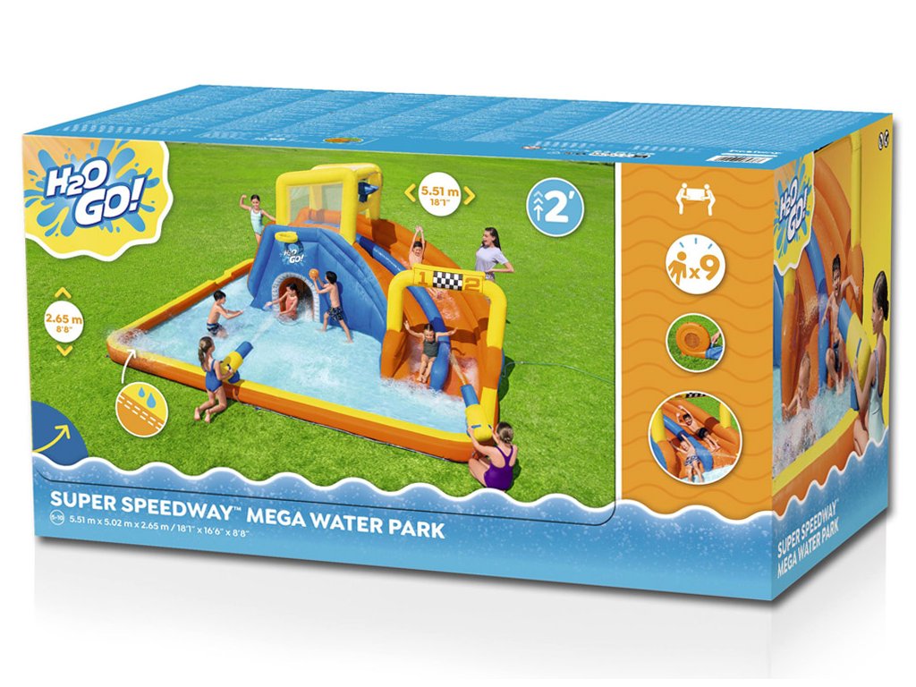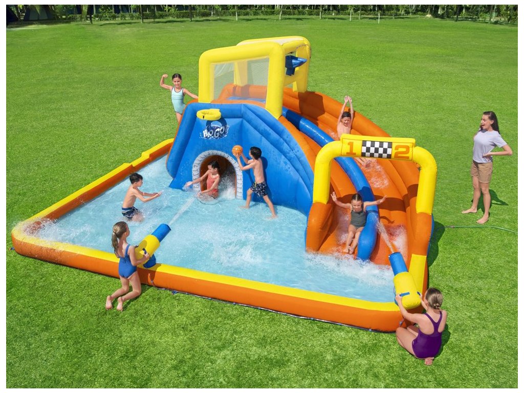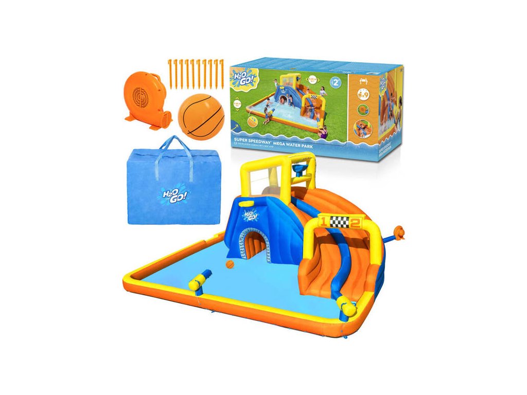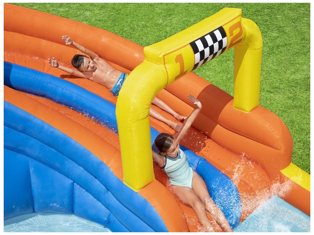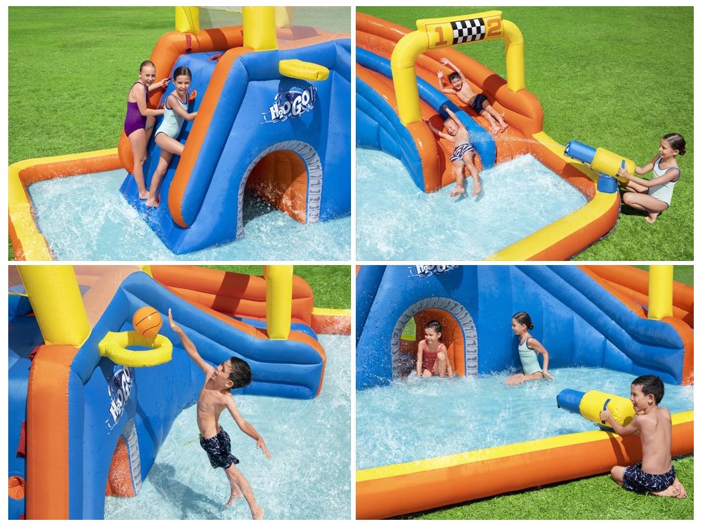 Színes felfújható vízi játszótér H2OGo! A Bestway Super Speedway™ autója órákon át remek szórakozást biztosít a kertben. Minden gyermek szeret a vízben játszani, és a Bestwaynek köszönhetően most saját mini víziparkot alakíthat ki a kertjében. Ez a felfújható vízi park 2 perc alatt felállítható! Csak egy sima felületű kertre van szüksége, és máris indulhat. A gyerekek nagyon örülni fognak, ha sok látnivaló van a ház alatt, versenyeket vagy versenyeket szervezhet a barátokkal, csobbanhat a vízben, mászhat és csúszhat le, kosárlabdázhat és vízágyúkat lőhet, hancúrozhat és hancúrozhat egész nyáron.
