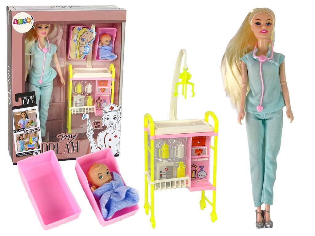 Bemutatunk egy egyedi orvos babát , amely hosszú, gyönyörű szőke hajával és kék szemével megörvendezteti a kis szíveket. Öltözete kék orvosi kötény és nadrág formájában, elegáns ezüst sarkú cipőkkel kombinálva magabiztos és stílusos megjelenést kölcsönöz.