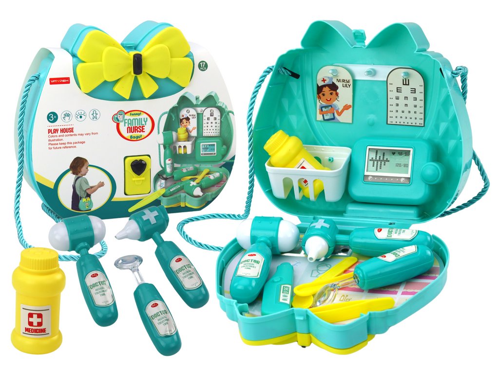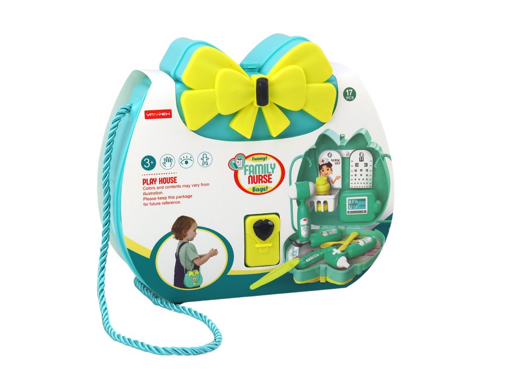 Az orvosi készlet egy pénztárcában nélkülözhetetlen választás a kis orvosok számára kalandjaik során. A sárga masnival és elegáns fonott pánttal díszített, gyönyörű türkiz színű, gyönyörű kézitáska nem csak a varázsát növeli, hanem megkönnyíti a teljes készlet hordozhatóságát, és biztosítja a mobilitást az orvosi küldetések során.