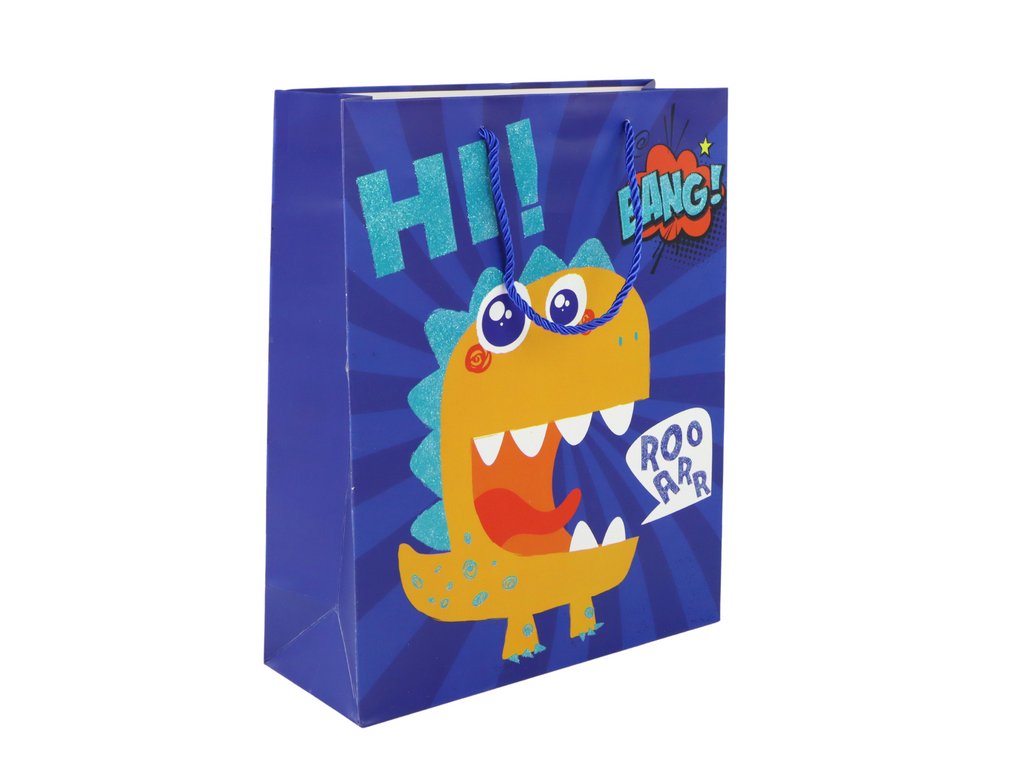 Ez a dinoszaurusz témájú, finom flitterrel ellátott papírzacskó nem csak az ajándékot védi, hanem egyedi hangulatot ad az alkalomnak. A kellemes kék kötött fülek eleganciát és kényelmet adnak a hordozás során.
