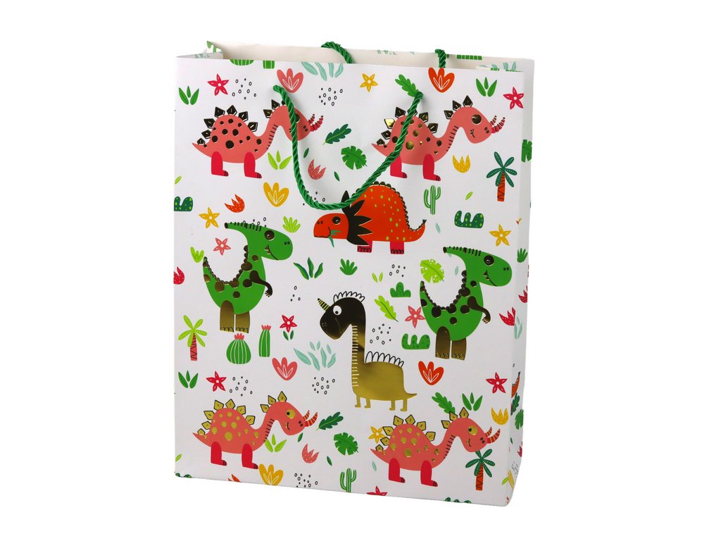 A dinoszaurusz motívummal díszített ajándéktáska kivételes módja annak, hogy hangsúlyozzuk az örömöt és a színes hangulatot, amikor ajándékot adunk szeretteinek. Ez az elegáns fehér táska remek hátteret biztosít az őt díszítő vidám és színes elemekhez.