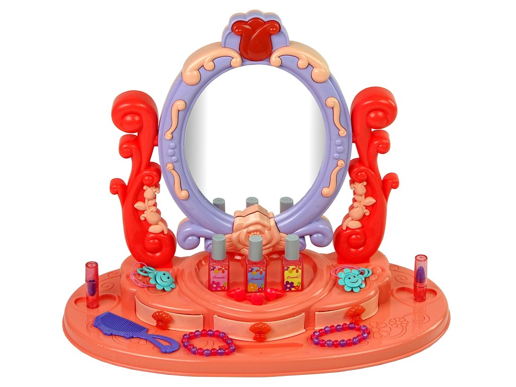 A fésülködőasztal tökéletes ajándék egy kislánynak. A piros két árnyalatú, lila elemekkel díszített bájos szettje minden hercegnő számára lehetővé teszi, hogy reggeltől a tükör előtt játsszon. A tükör biztonságos műanyagból készült, melyben a kis hercegnő láthatja gyönyörű arcát. A tükör alsó részén 3 fiók található tengeri kagylókkal.