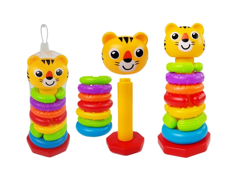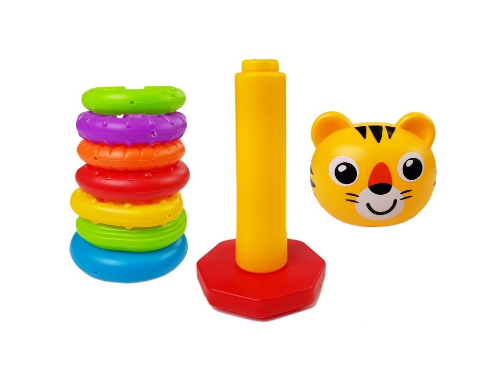 A szivárvány színeiben pompázó piramis egy olyan játék, amely tökéletesen támogatja a gyermek fejlődését. Különböző színű és formájú gyűrűkből áll. A játék tetején található a legkisebb csésze tigrismintával. A gyűrűk biztonságos, nem mérgező anyagból készülnek, amelyet erősség és tartósság jellemez. A piramis nagyon sima, lekerekített formájú, ami hozzájárul a használat biztonságához.