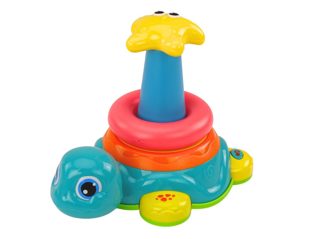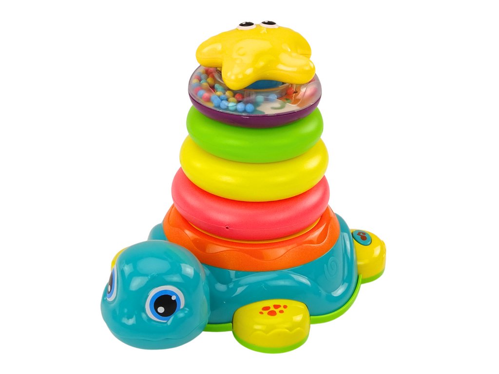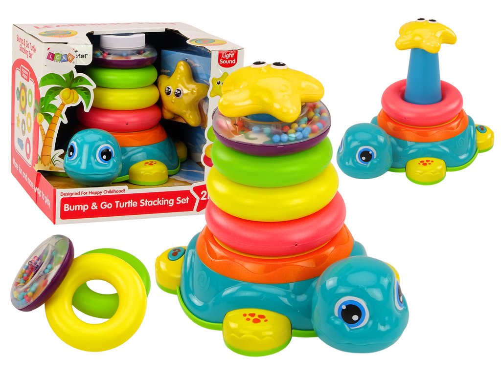A 2 az 1-ben teknős piramis egy hihetetlenül interaktív és oktató eszköz, amely nem csak szórakozást nyújt, hanem serkenti gyermeke sokrétű képességeinek fejlődését is. A készlet 4 színes gyűrűből áll, melyek közül az egyik csörgőként is funkcionál, és egy újabb érzékszervi elemet hoz, amely hangok felfedezésére ösztönzi a gyermeket. Minden szilárd alapon áll egy lovagló teknős formájában, amely nem csak hangokat és fényeket bocsát ki, hanem az akadályokra is reagál, ami még dinamikusabbá és interaktívabbá teszi a játékot.
