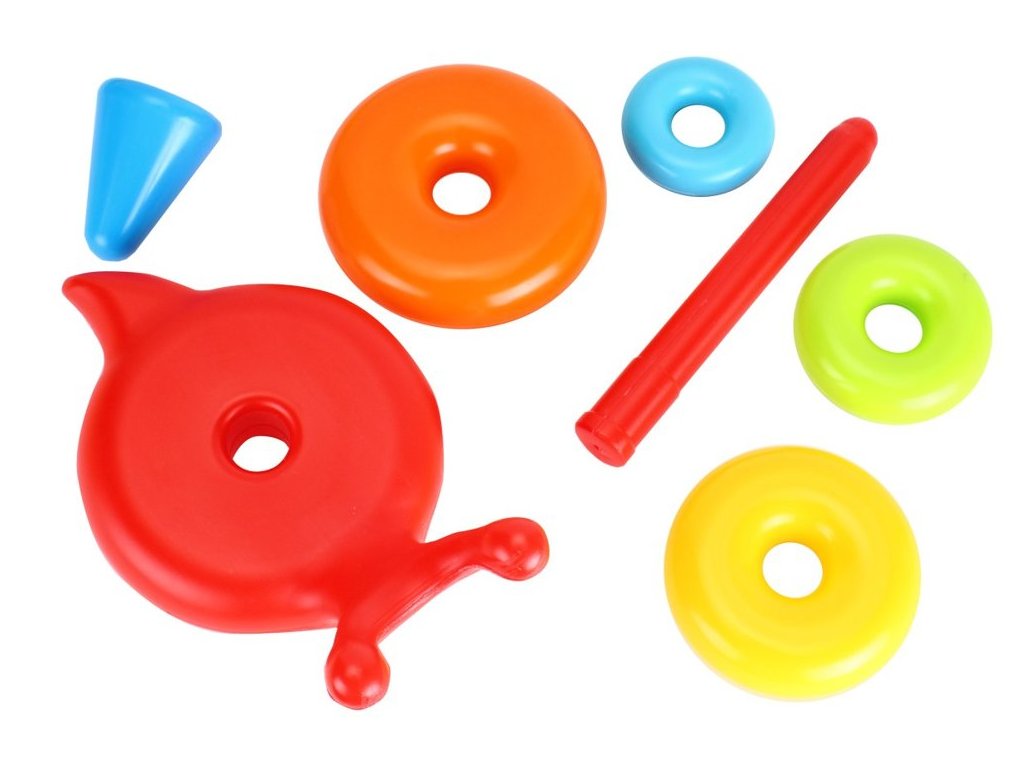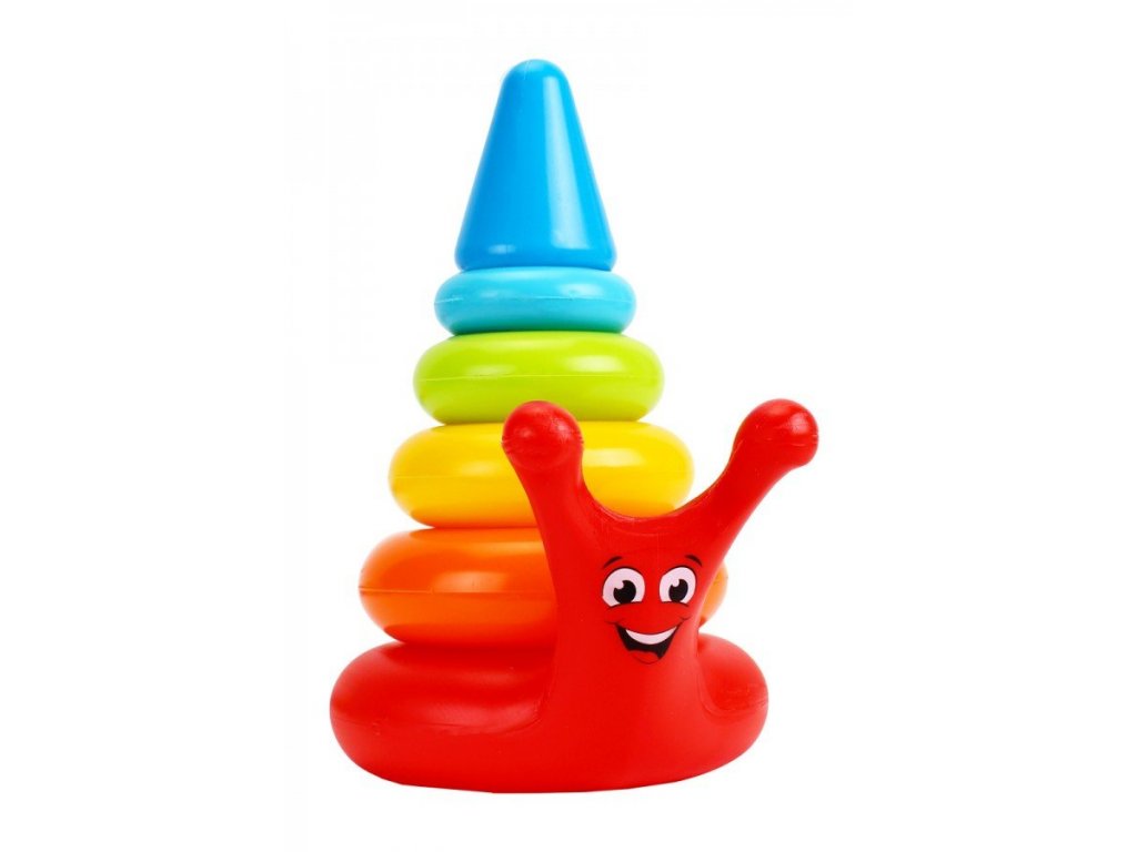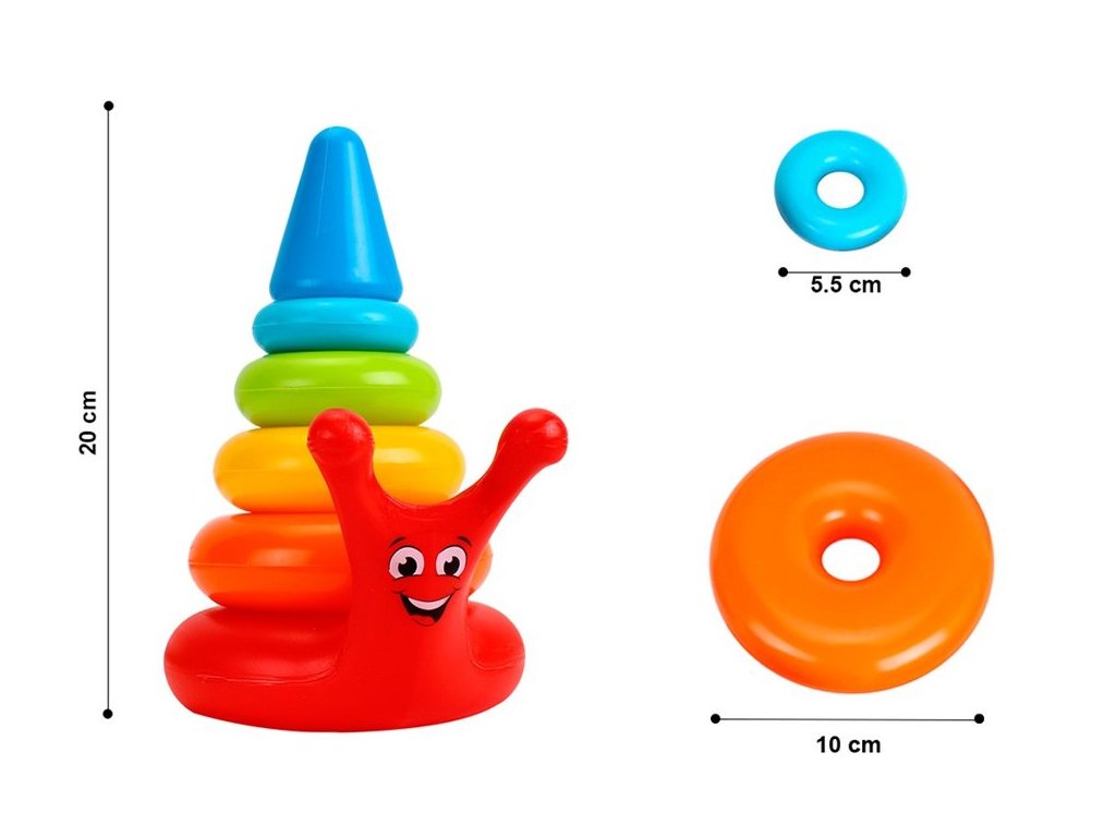 A szivárvány színeiben pompázó vidám piramis egy olyan játék, amely kiválóan alkalmas a kisgyermekek fejlesztésére. Különböző színű és méretű karikákból áll. A játék tetején egy kúp található, amely lezárja a piramist. Az alap csiga alakú - aranyos fülekkel, farokkal és ragyogó mosollyal. A játék biztonságos, nem mérgező anyagból készült, amelyet robusztusság és tartósság jellemez. A piramis nagyon sima, lekerekített formájú, ami növeli az elem használatából származó biztonságot.