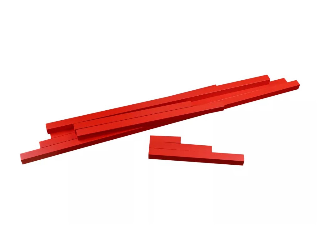 A készlet 10 db bükkfából készült rudat tartalmaz. A legrövidebb rúd 10 cm hosszú, és minden következő 10 cm-rel hosszabb, egészen a leghosszabb, 100 cm-es rúdig. A rudak keresztmetszete állandó, 2,5 x 2,5 cm. A rudak pirosak, és a hosszúságok vizuális és tapintásos megkülönböztetésére szolgálnak.