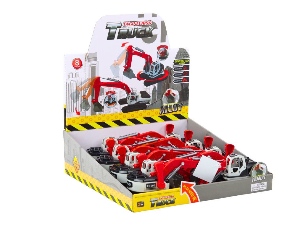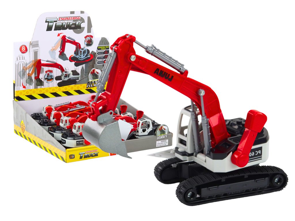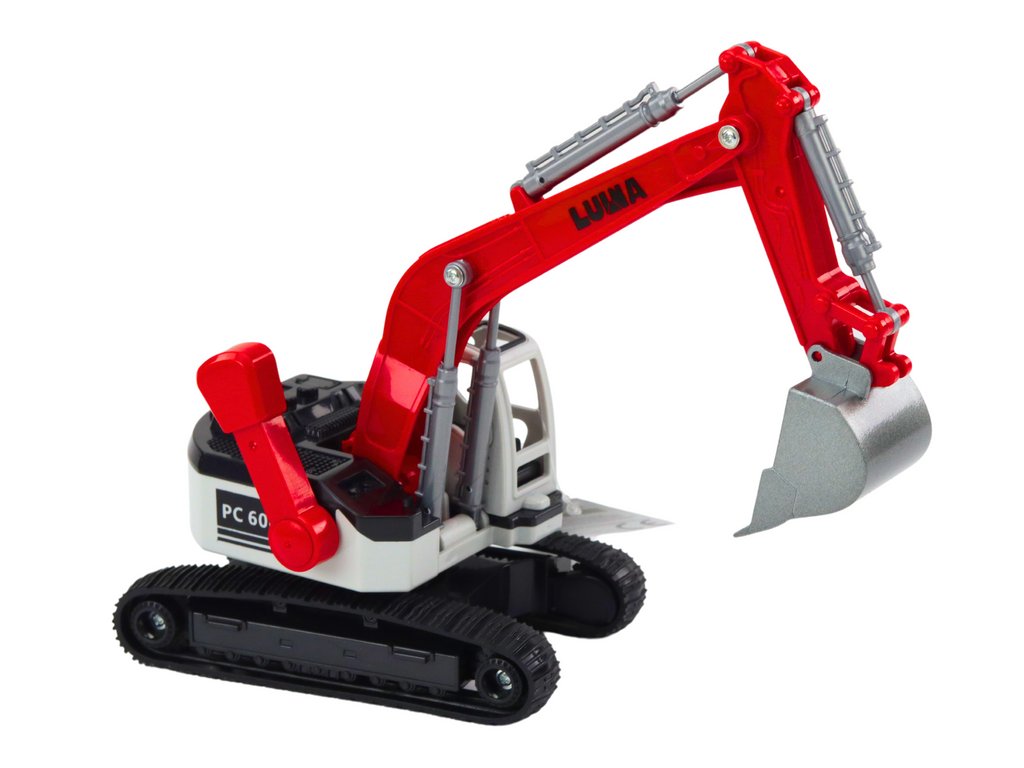 A lánctalpas kotrógép fémkanállal, fehér-piros színben, lenyűgöz a részletekkel. Az állítható gém és a 360 fokban elforgatható fülke valósághű játékmenetet biztosít.
