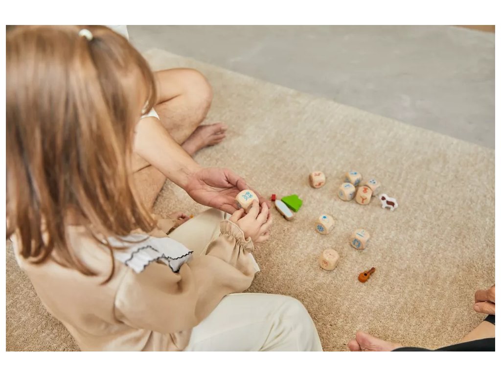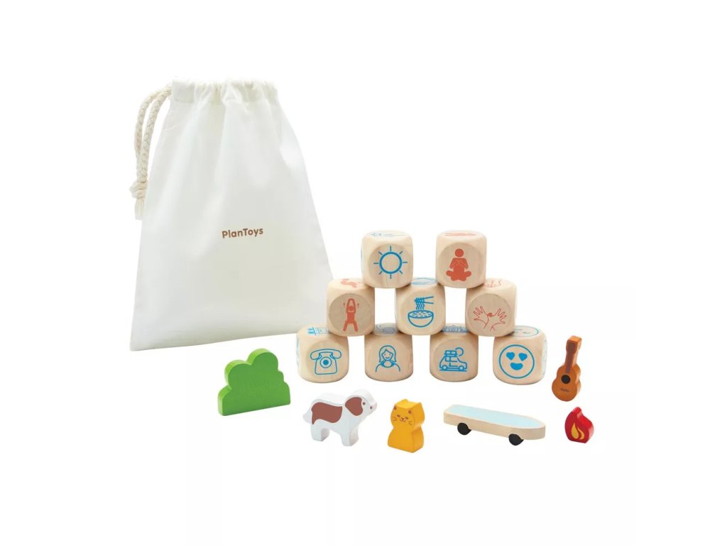 Szórakoztató fa játék az egész család számára, amely fejleszti a koncentrációt, a memóriát és a kommunikációs készségeket a kockákon lévő képek alapján történő történetek létrehozásával.