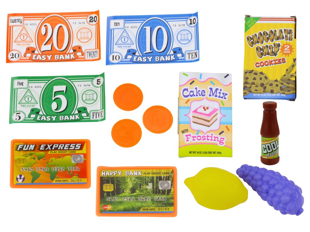 A játék még valósághűbbé tétele érdekében a készlet bankjegyeket, érméket és hitelkártyákat tartalmaz, így a gyerekek a vásárlók és az eladók szerepét is eljátszhatják. Ez egy kiváló lehetőség arra, hogy megtanulja számolni a pénzt és javítani az interperszonális készségeket a bolti interakciók szimulálásával.