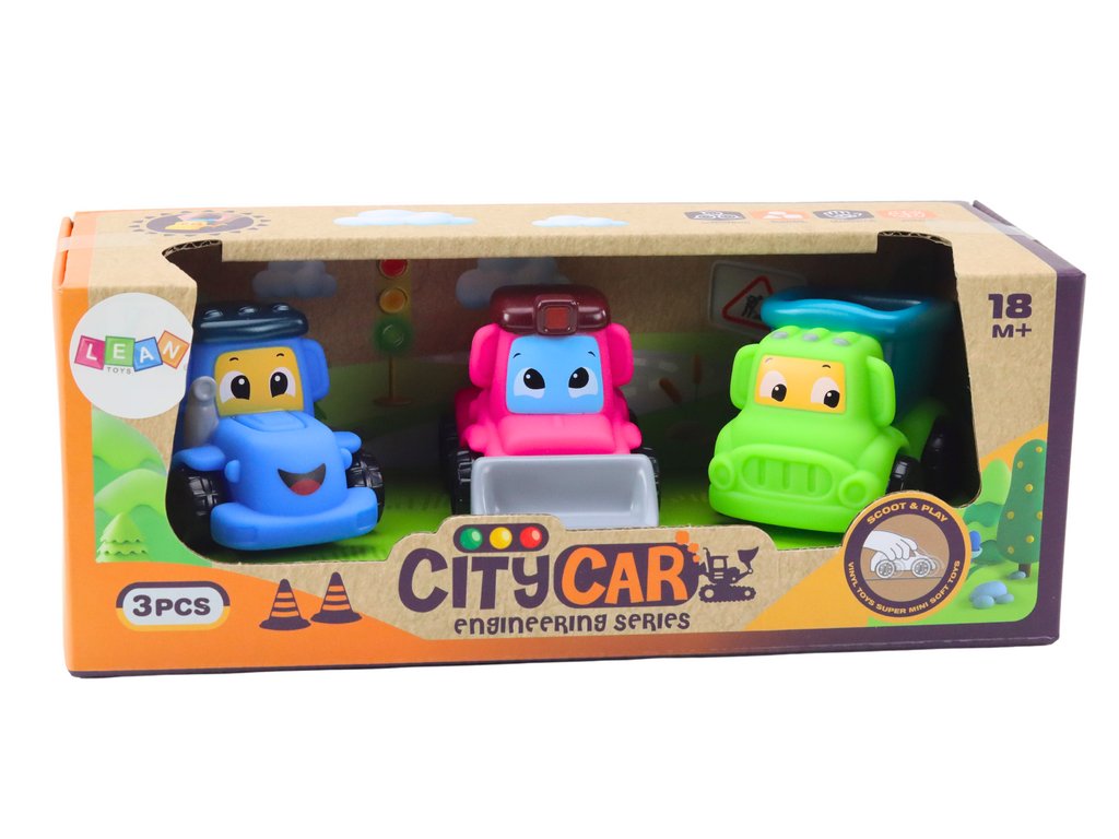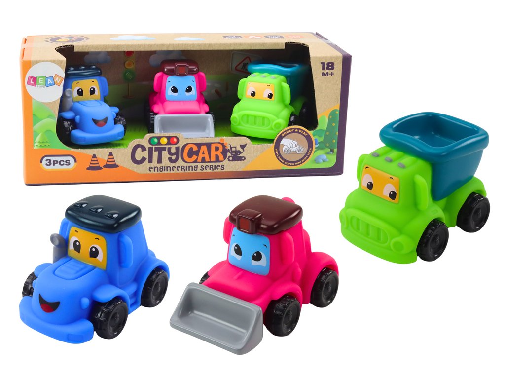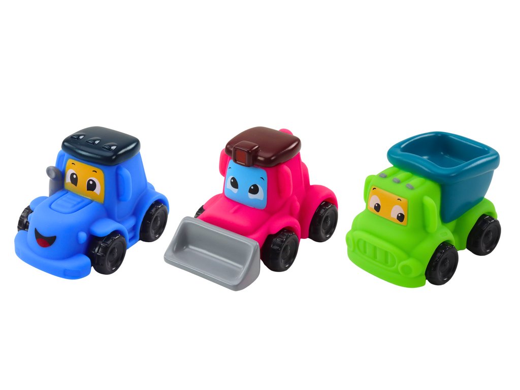A 3 mezőgazdasági autóból álló készlet ideális játék kisgyermekek számára, amely egyesíti a biztonságot, a kreativitást és a szórakozást. Három aranyos járművet tartalmaz ( traktor, buldózer és billenőkocsi) puha gumiból és tartós műanyagból készült, amely mentes az éles szélektől és apró alkatrészektől.