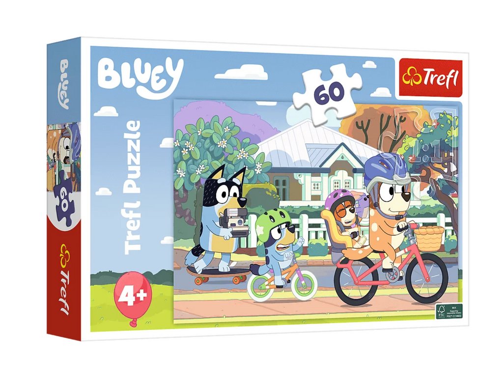 A Trefl márka "Cheerful Bluey" puzzle 60 darabot tartalmaz, és a Bluey mese kis rajongói számára készült. Kiváló minőségű anyagokból készültek, speciális kalanderezett papírt használnak, amely megkönnyíti a hajtogatást és visszaveri a fényt.