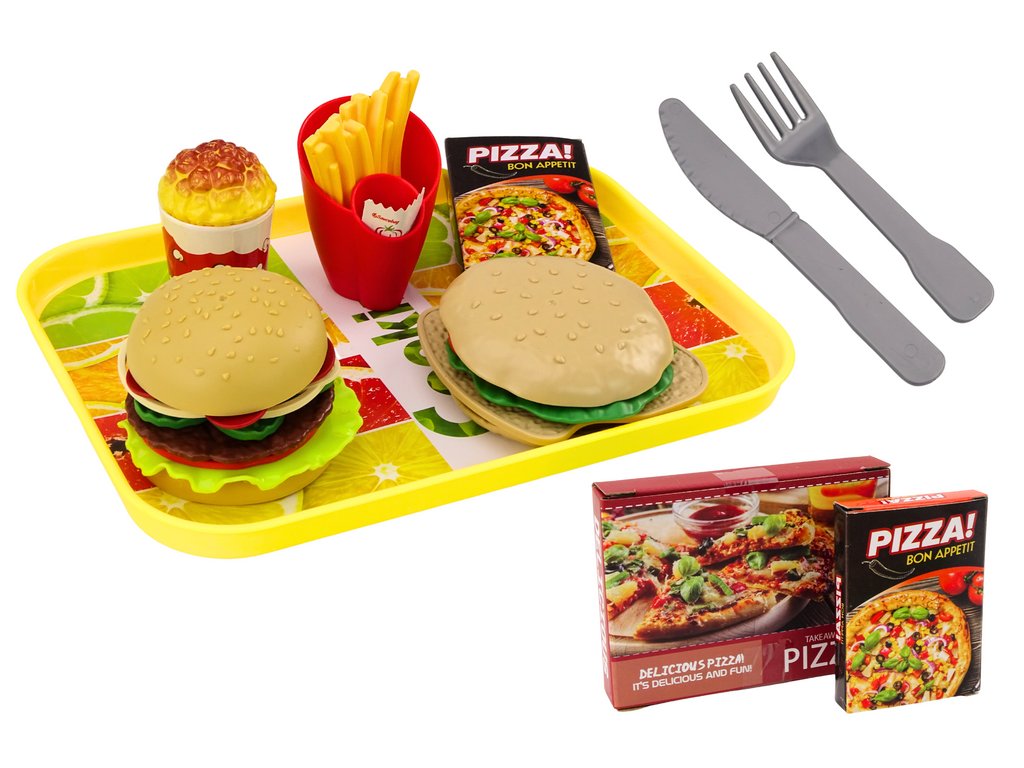 A készlet olyan összetevők széles választékát tartalmazza, amelyek a népszerű gyorsételekre jellemzőek. Köztük van egy 4 részre osztott pizza, két hamburger, sült krumpli, popcorn és egyéb ízletes kiegészítők.