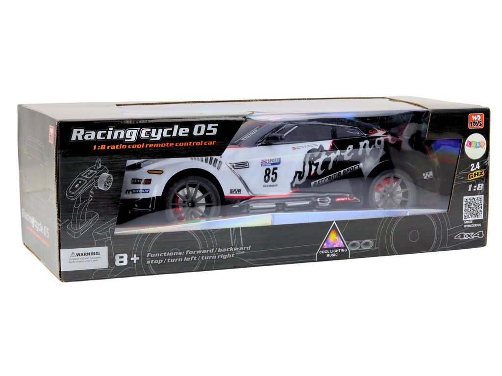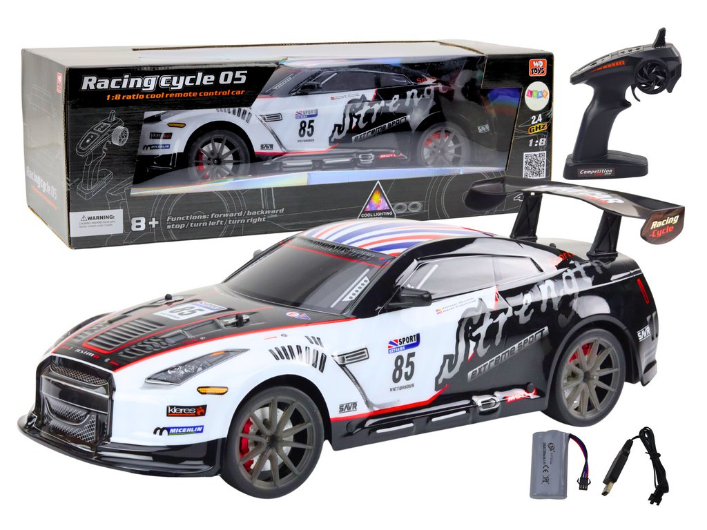 A nagy, 1:8 méretarányú távirányítós sportautó dinamikus dizájnnal, fekete-fehér nyomtatással, valamint valósághű fény- és hangeffektusokkal rendelkezik. Ütésálló, intenzív versenyzésekhez ideális, és könnyen kezelhető 2,4 GHz-es távirányítóval . Ez a modell nagyszerű választás a gyors autók és az akciós szórakozás szerelmeseinek.